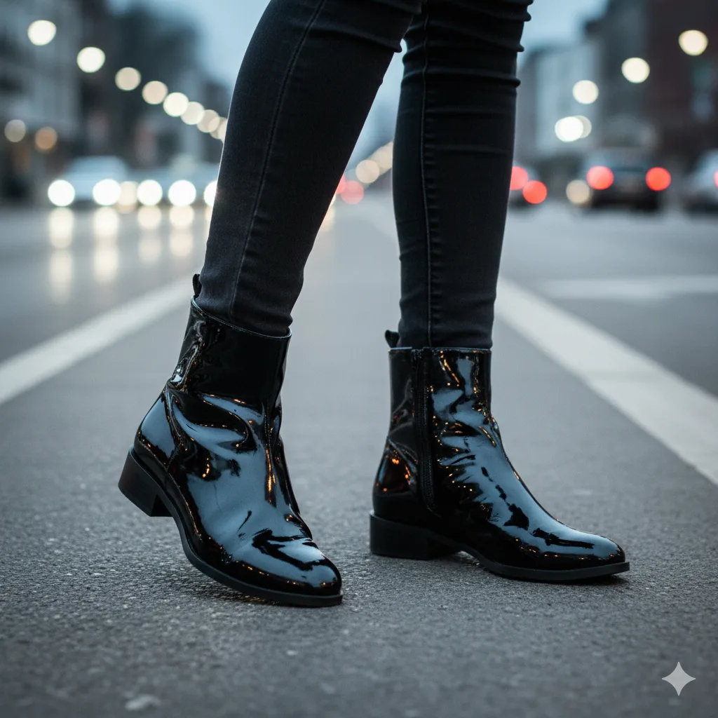 Make a high-shine statement this season with glossy patent boots. Their reflective surface catches light beautifully — perfect for evening looks. Try them in burgundy or emerald for an eye-catching pop against winter neutrals.