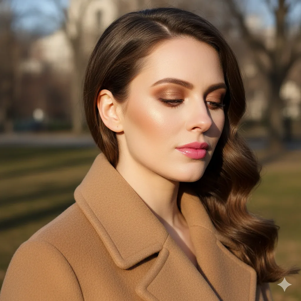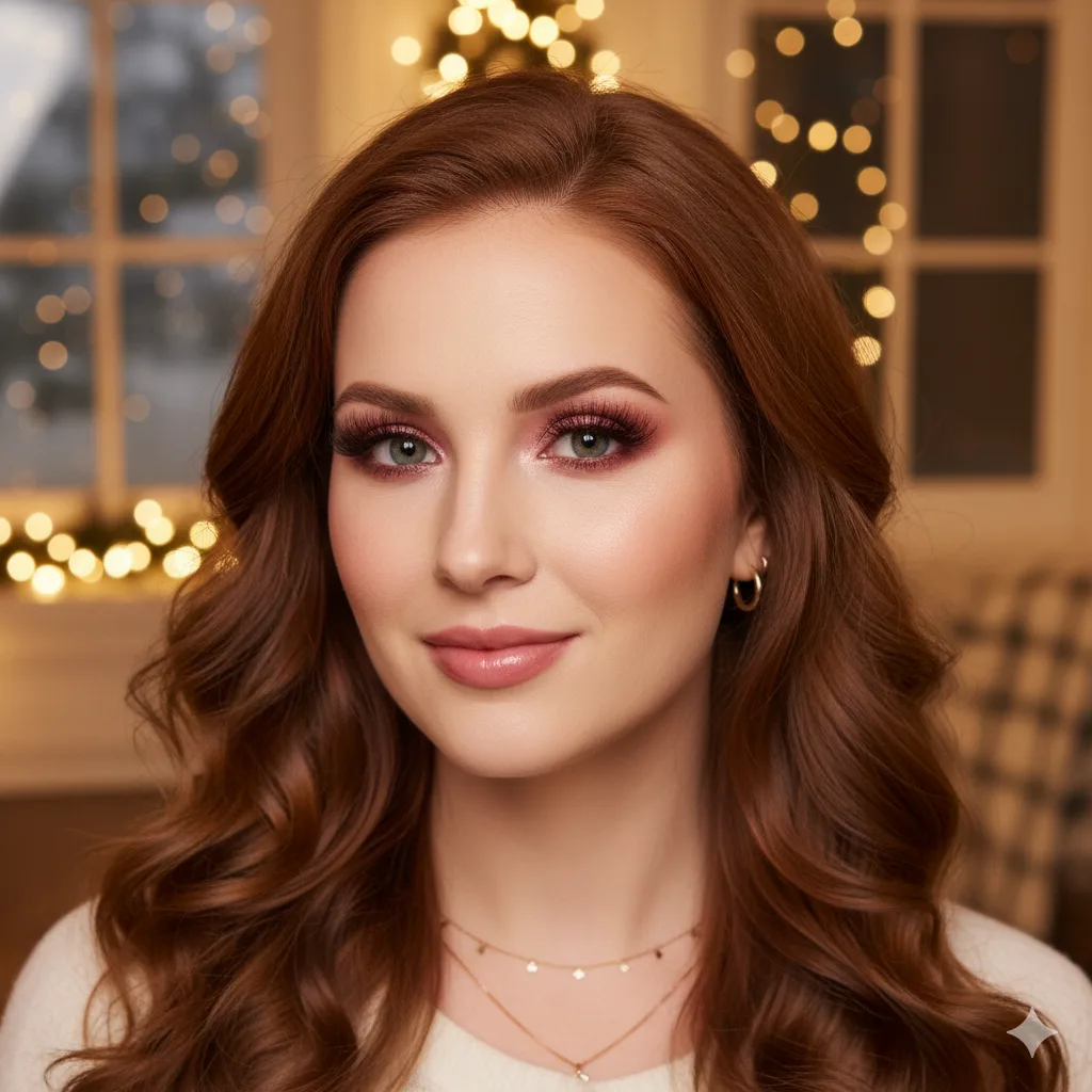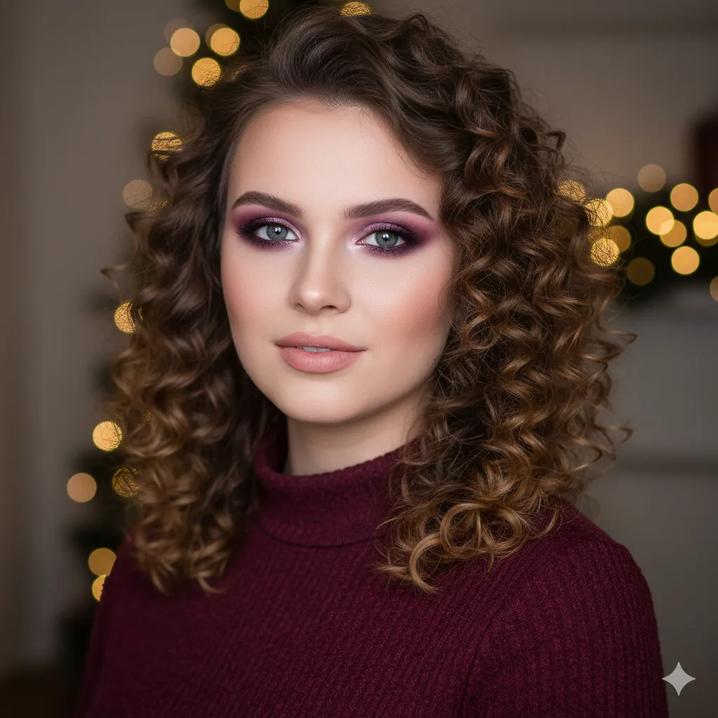 Bronzed lids and highlighter sculpt the face while keeping it radiant. Best for warmer undertones and medium to tan skin. Style with soft curls and gold jewelry for a festive, sun-kissed winter vibe.