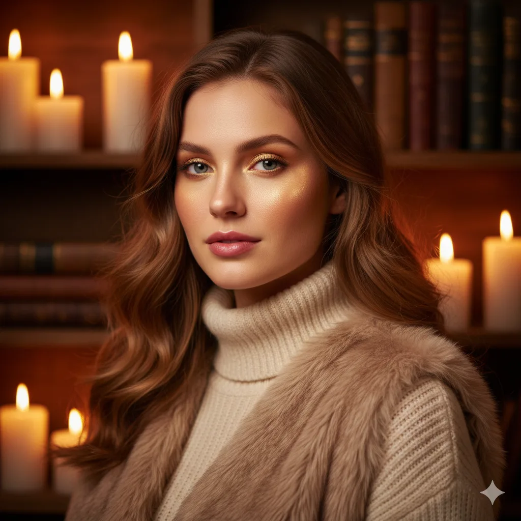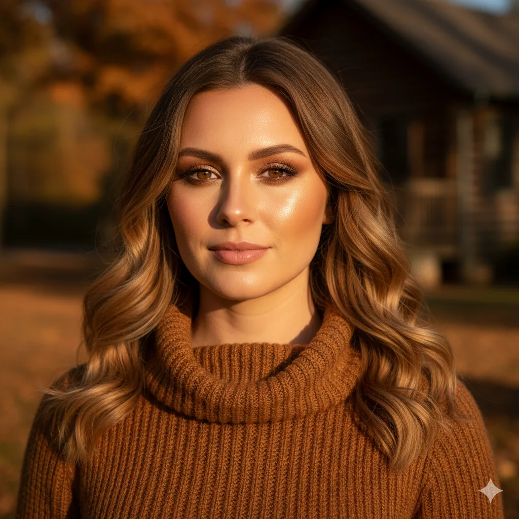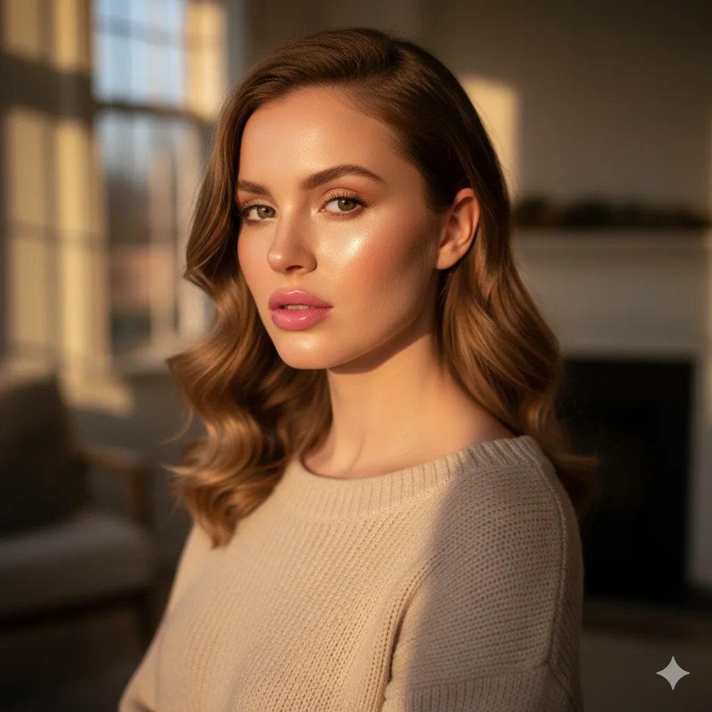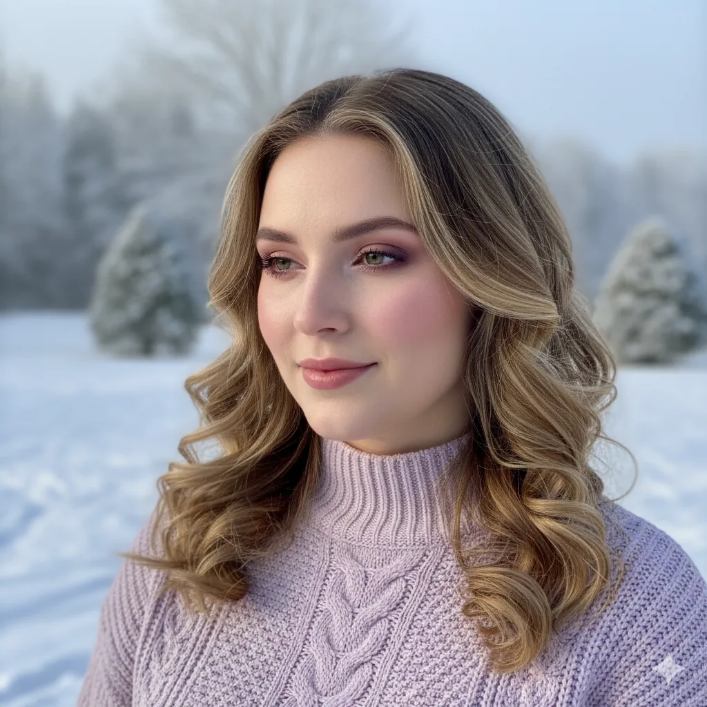 Bronzed lids and highlighter sculpt the face while keeping it radiant. Best for warmer undertones and medium to tan skin. Style with soft curls and gold jewelry for a festive, sun-kissed winter vibe.