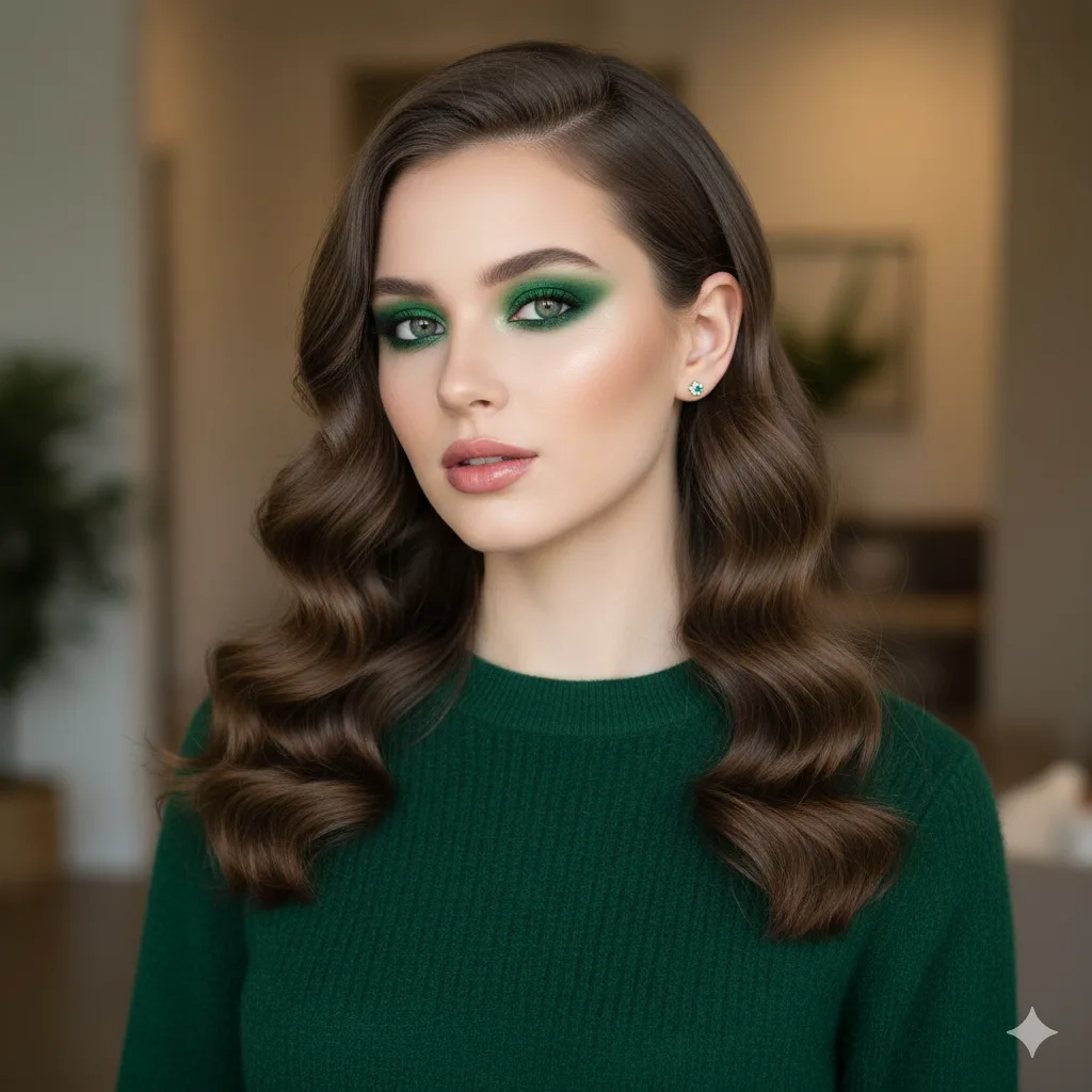 Deep green eyeshadow adds mystery and holiday flair. Perfect for brown or hazel eyes, this rich shade exudes winter luxury. Keep lips neutral and cheeks softly bronzed for balance and evening charm.