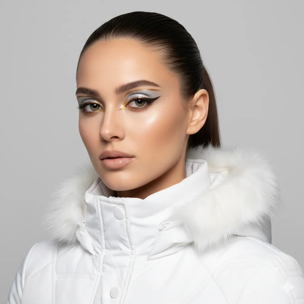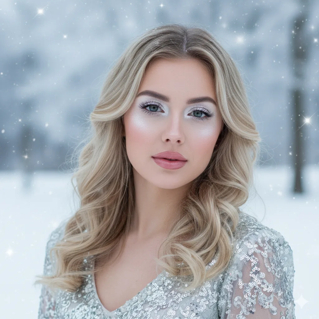 An icy white shimmer over lids instantly channels winter frost. Great for women with cool skin tones or light eyes. Pair with a pink nude lip and silver accessories for a snow-queen finish.