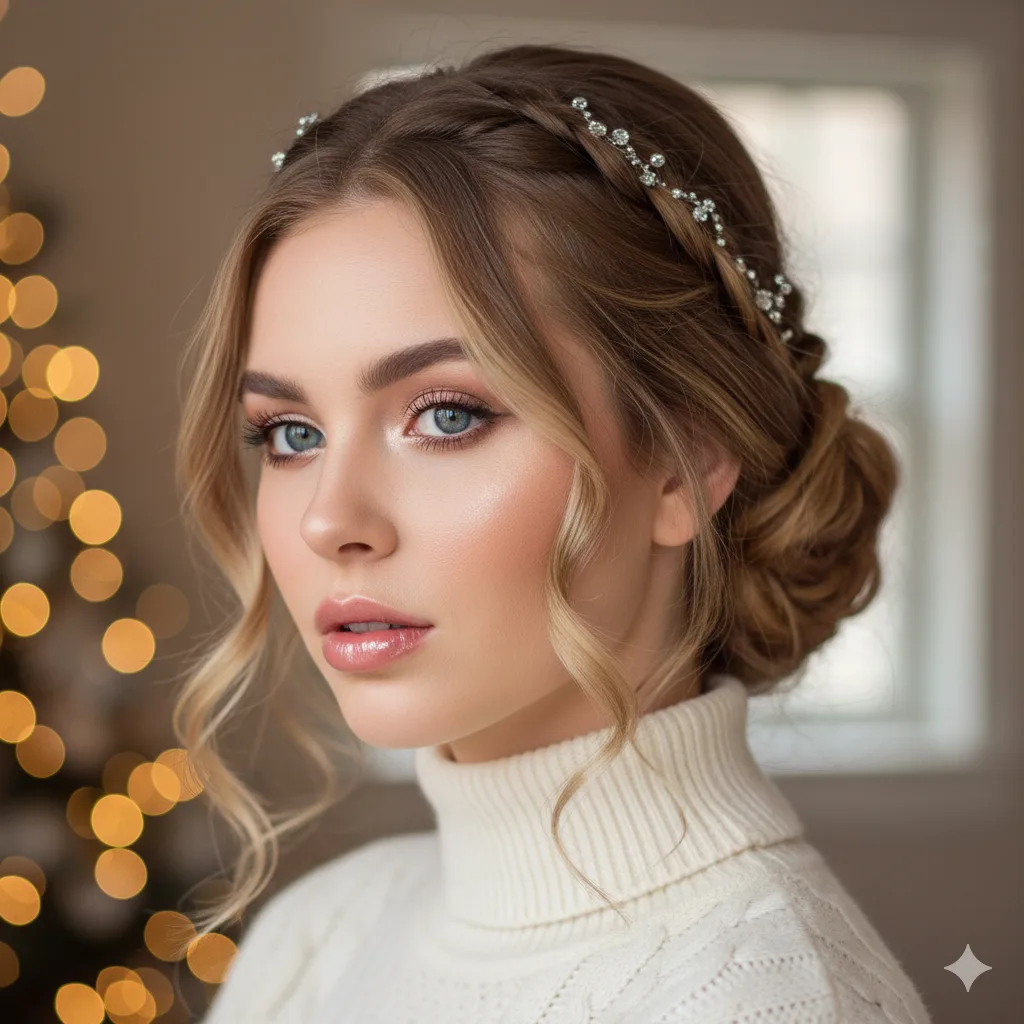 This look focuses on hydrated, glossy skin with soft champagne highlighter. Lightly defined lashes and pink gloss complete it. Ideal for women who prefer understated yet luminous festive beauty.