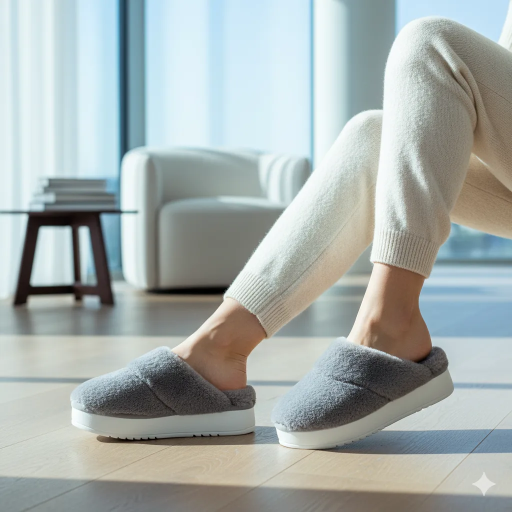 These crisscross sandals bring spa-day comfort home. Their neutral hues and soft faux fur texture make them ideal for both loungewear and post-shower relaxation.