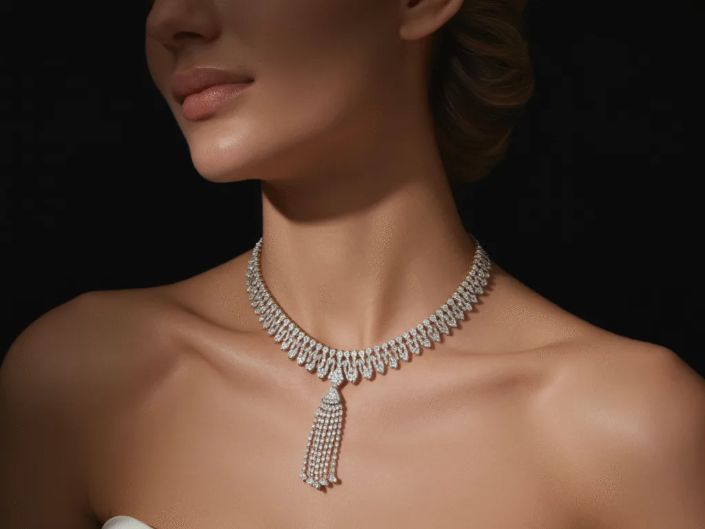 Chokers make a modern yet glamorous statement. A diamond choker fits perfectly with sleek updos and strapless gowns, framing the face and collarbone. Suits brides with angular jawlines, enhancing sharp elegance. Keep earrings minimal for balance.