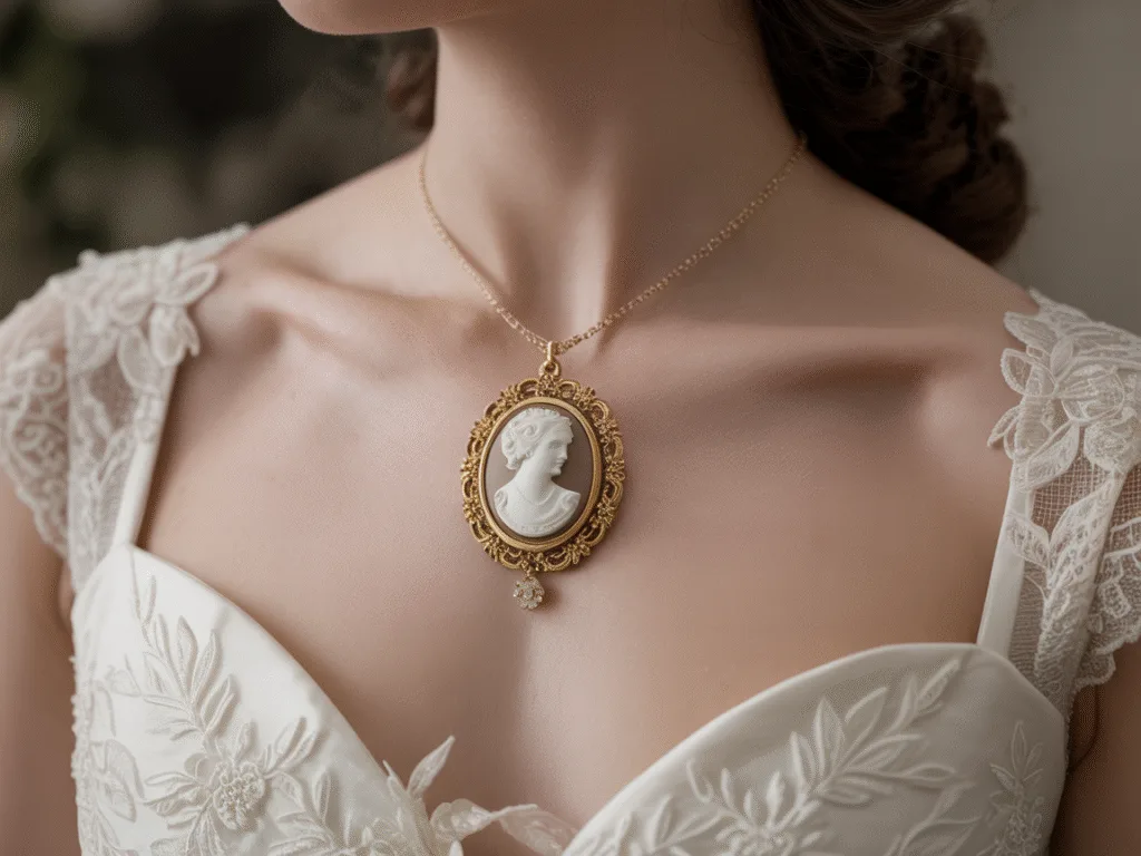For brides with a love for heritage, a cameo necklace adds antique romance. Suited to lace gowns and vintage-inspired themes, its delicate detailing pairs well with soft curls and muted makeup. A family heirloom cameo creates even deeper emotional charm.