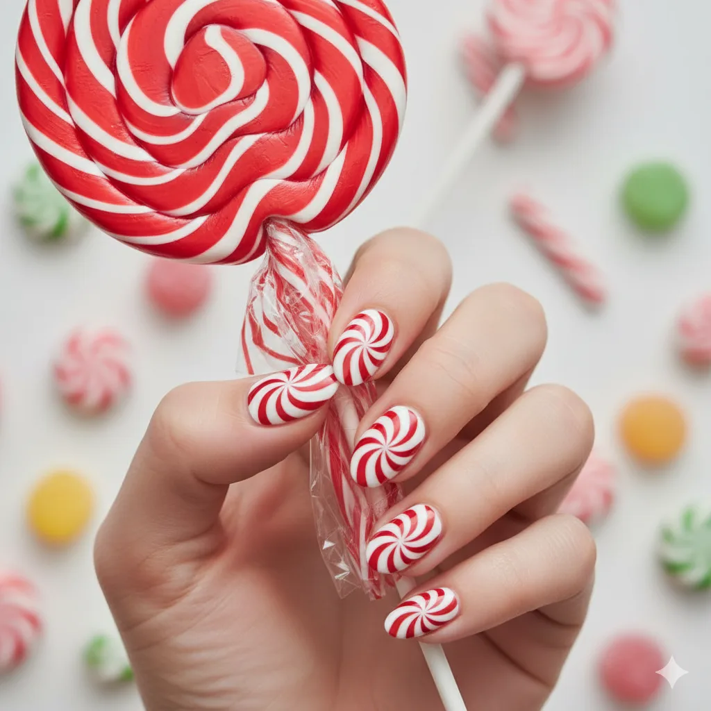 Red and white stripes with a glossy topcoat — fun, festive, and full of Christmas cheer. Perfect for almond nails, this playful pattern works best for casual holiday gatherings or themed parties.