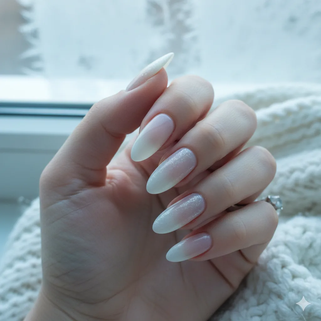 Blend soft white into clear tips for a frosty ombre effect. This design is elegant, clean, and perfect for everyday winter wear.