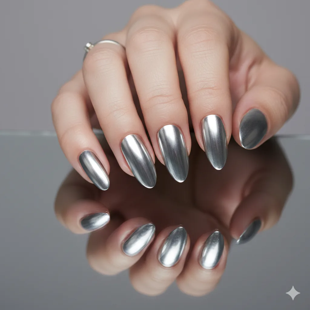 Shiny silver polish or chrome powder creates futuristic festive nails. Perfect for night events or metallic-themed outfits — very women’s style trends 2025.
