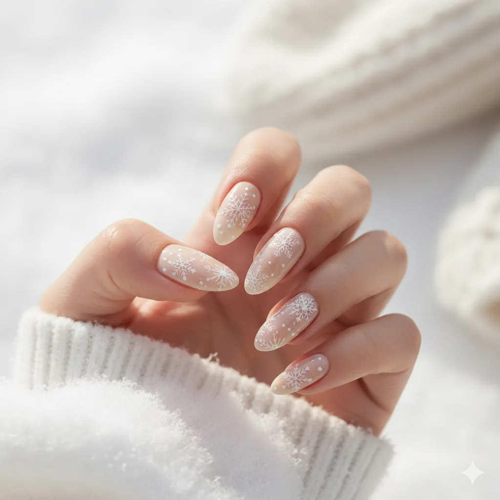A sheer nude base adorned with delicate white snowflakes gives a minimalist winter vibe. This design flatters longer almond nails and looks refined yet festive.
