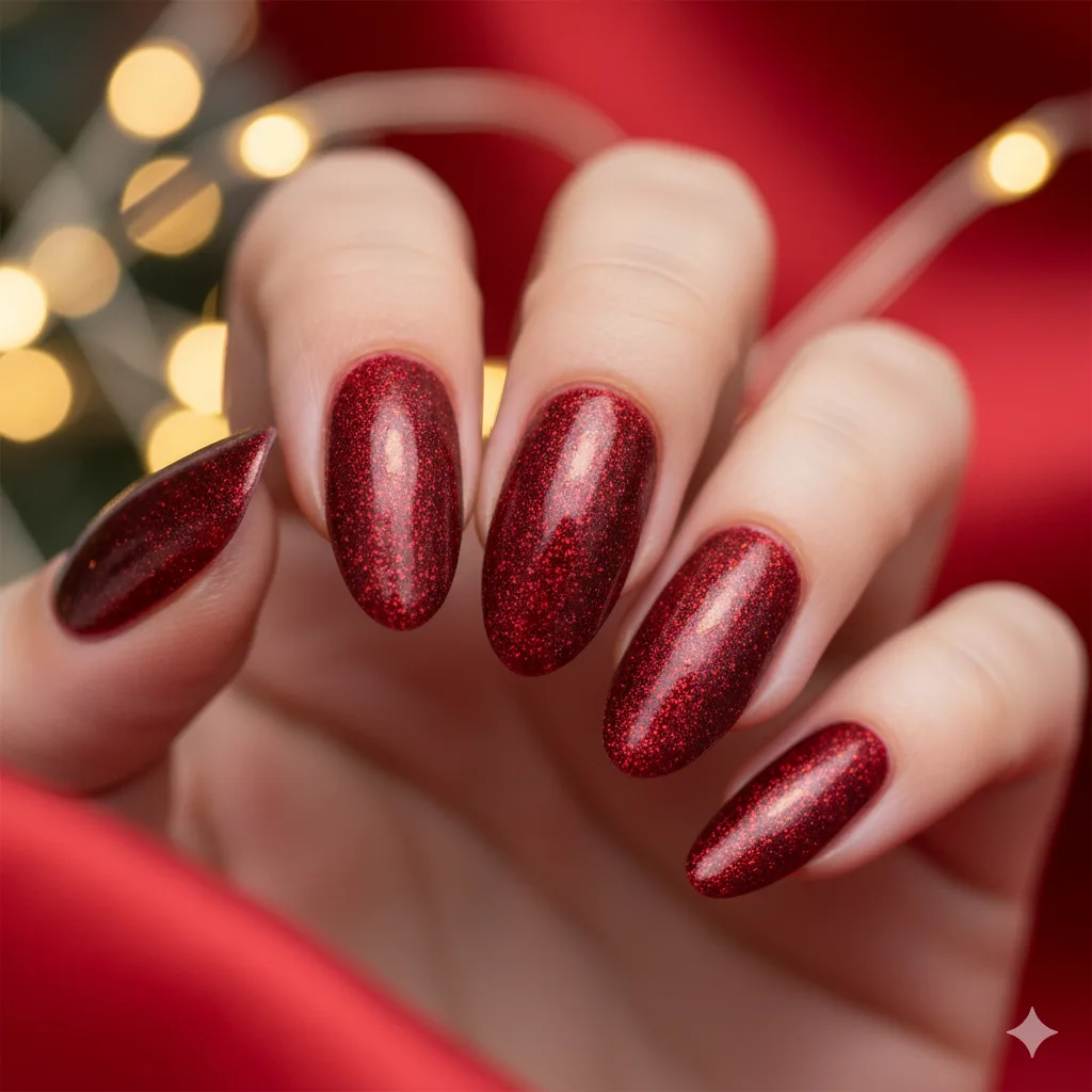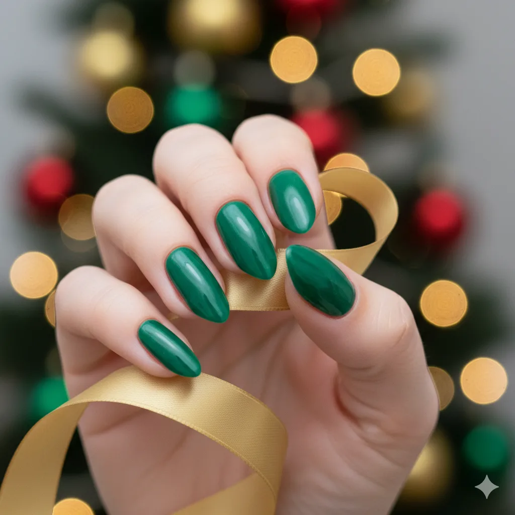 Emerald tones feel regal and seasonal. A glossy finish adds richness, while gold accents or rhinestones elevate the festive feel. This shade flatters warm undertones and adds sophistication to any Christmas look.