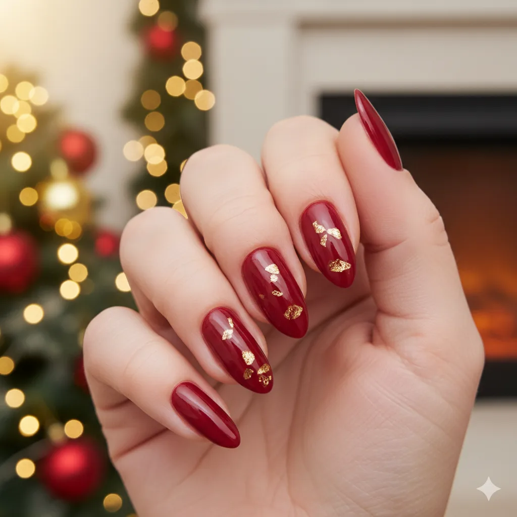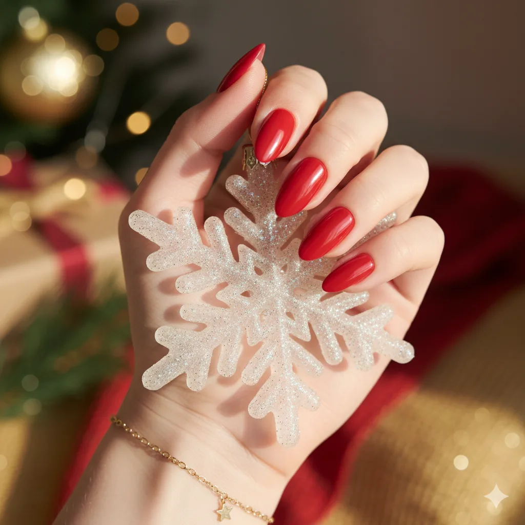Nothing says Christmas like a bold red. This glossy almond manicure enhances every skin tone and works beautifully with festive outfits. Ideal for parties or cozy nights in, it’s timeless and elegant — pair with gold rings for extra glam.