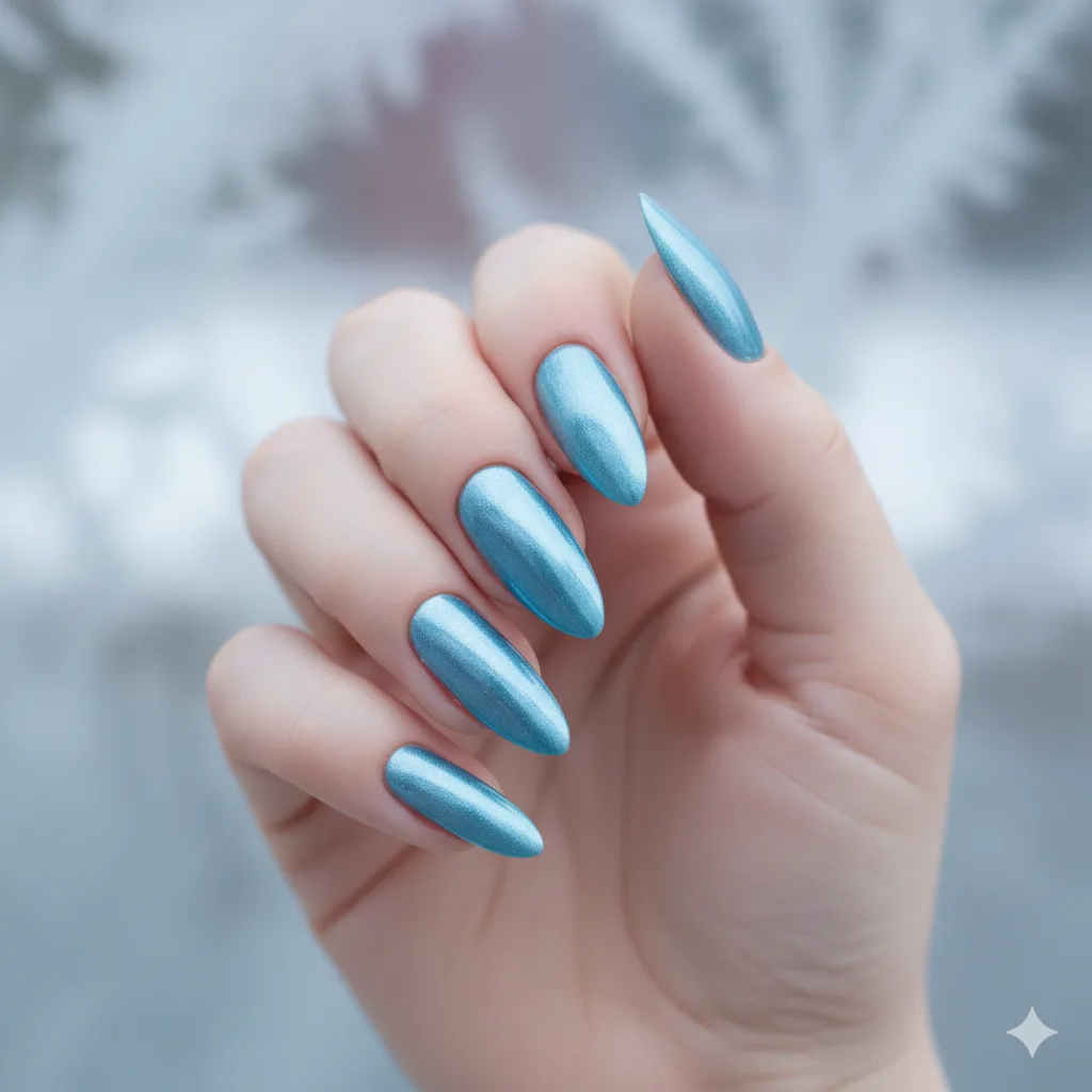 Cool-toned metallic blues mimic the shimmer of winter frost. Ideal for almond nails, they bring a futuristic touch to holiday looks while staying perfectly seasonal. Pair with silver jewelry for balance.