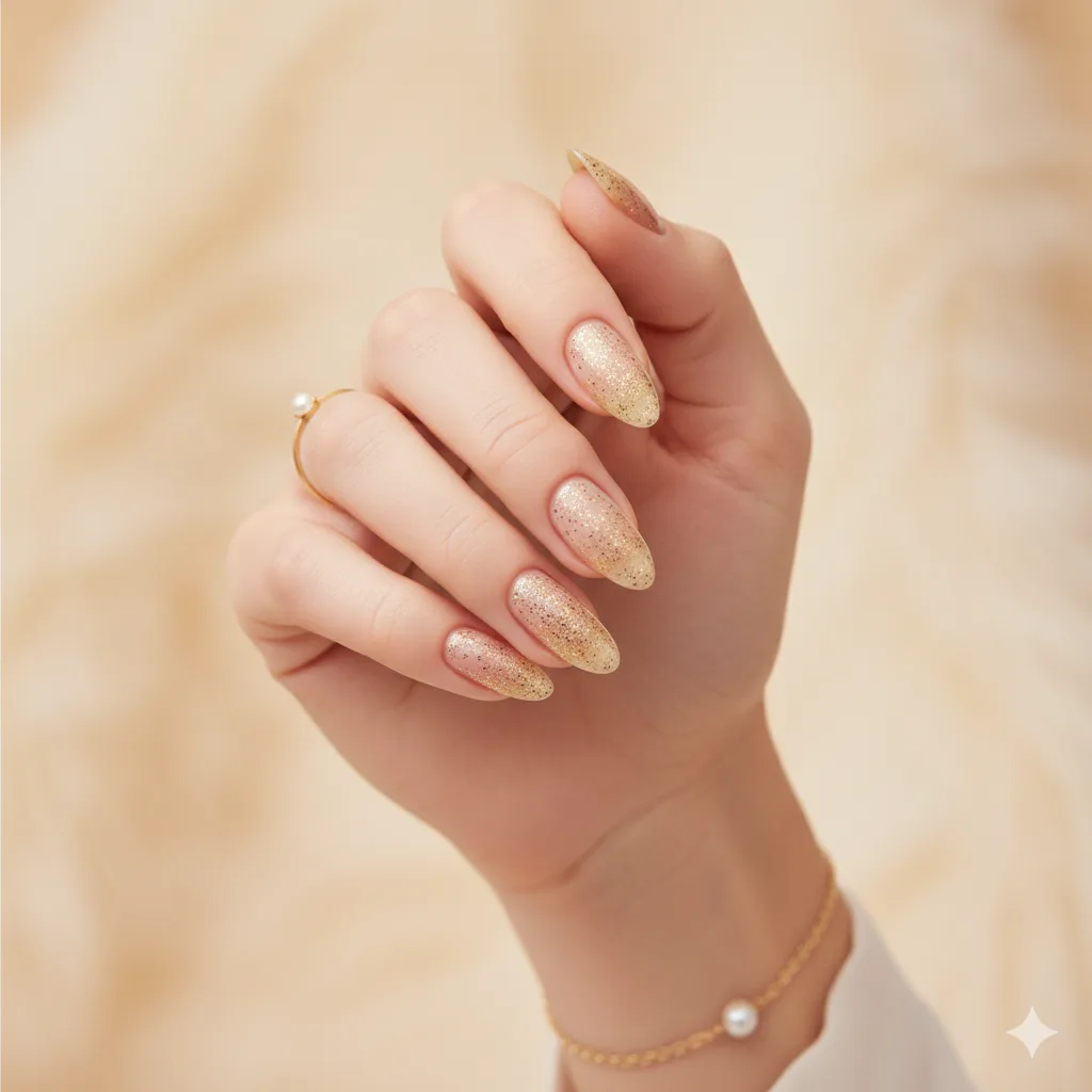 A neutral base topped with fine gold shimmer — elegant, understated, and endlessly versatile. Ideal for work parties or brunch outings.