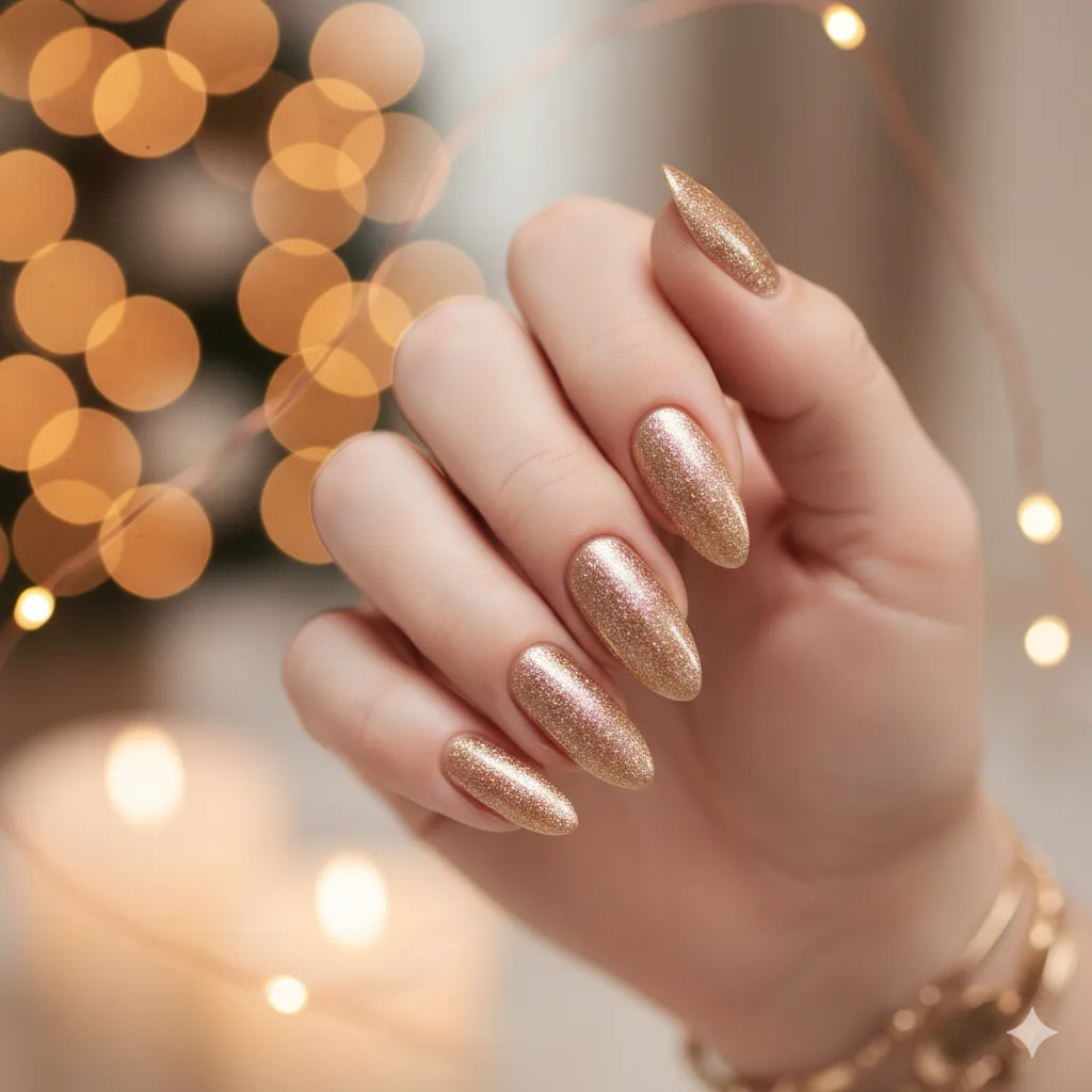 Soft gold champagne polish adds a warm glow to your holiday look. Ideal for women who love subtle sparkle without going overboard.