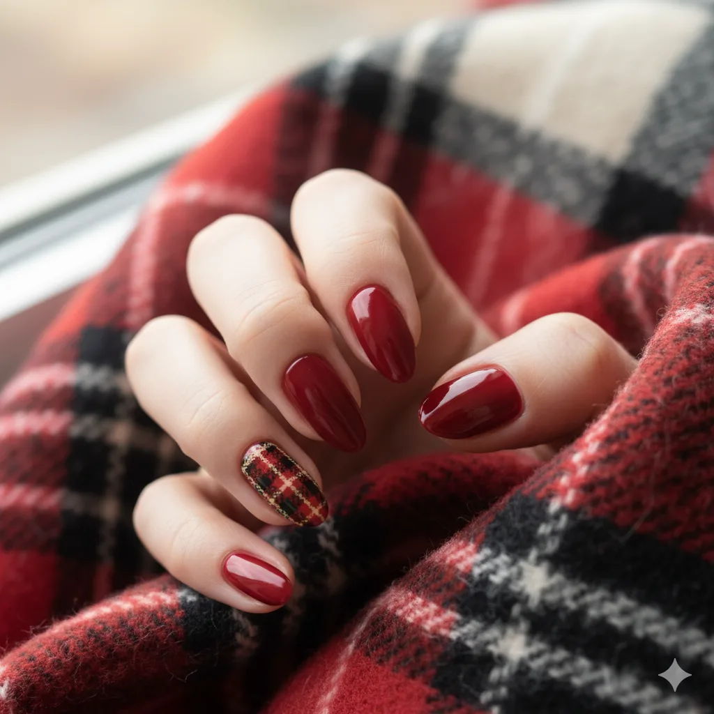 Classic red and green plaid nail art on one or two almond nails adds a cozy, winter fashion vibe. Perfect for Christmas sweaters and festive photos.