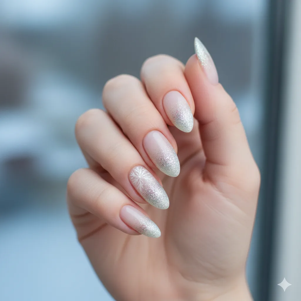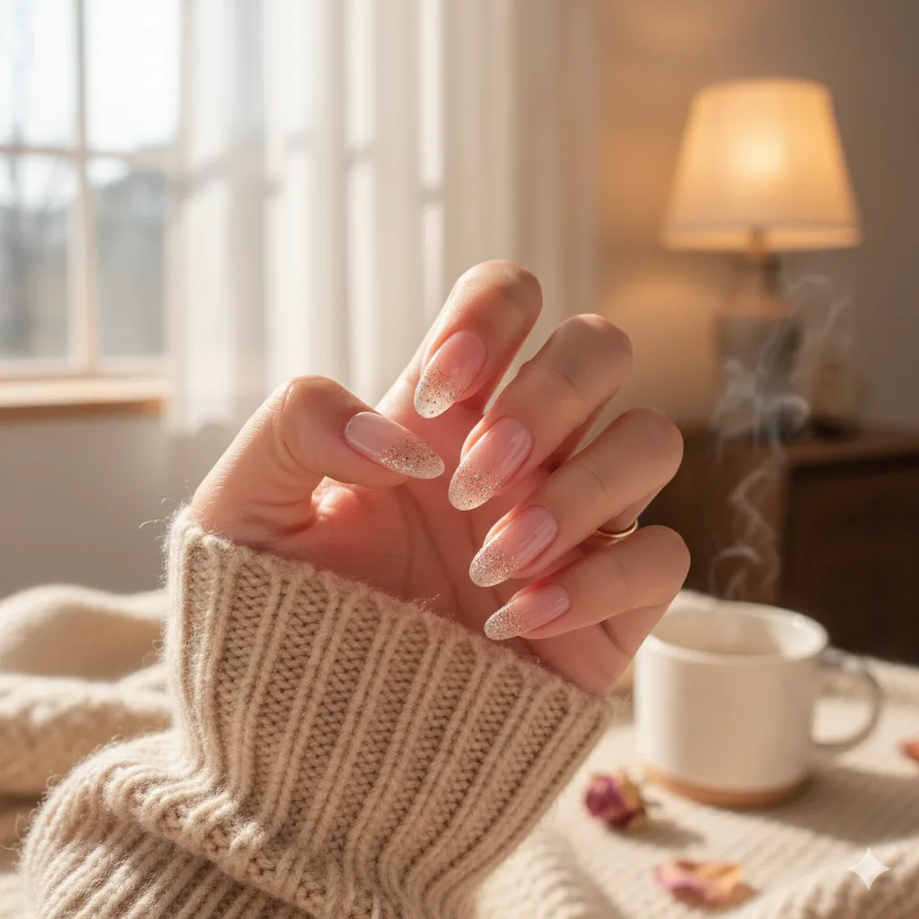 For those who love feminine elegance, pink with glitter fade tips gives a soft, snowy feel. Suits all skin tones and works beautifully with minimal jewelry.