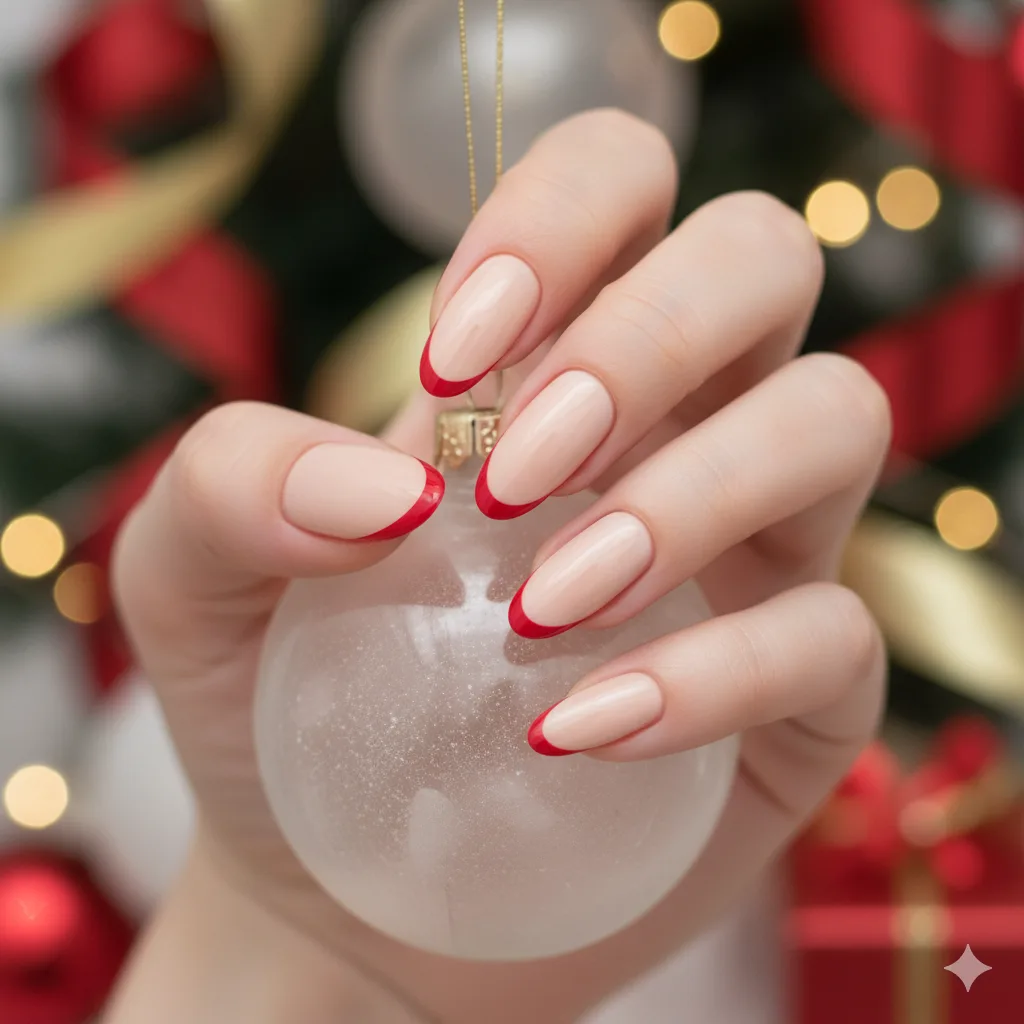 A festive twist on the French manicure — classic nude base with bold red almond tips. Simple yet powerful for a polished Christmas vibe.
