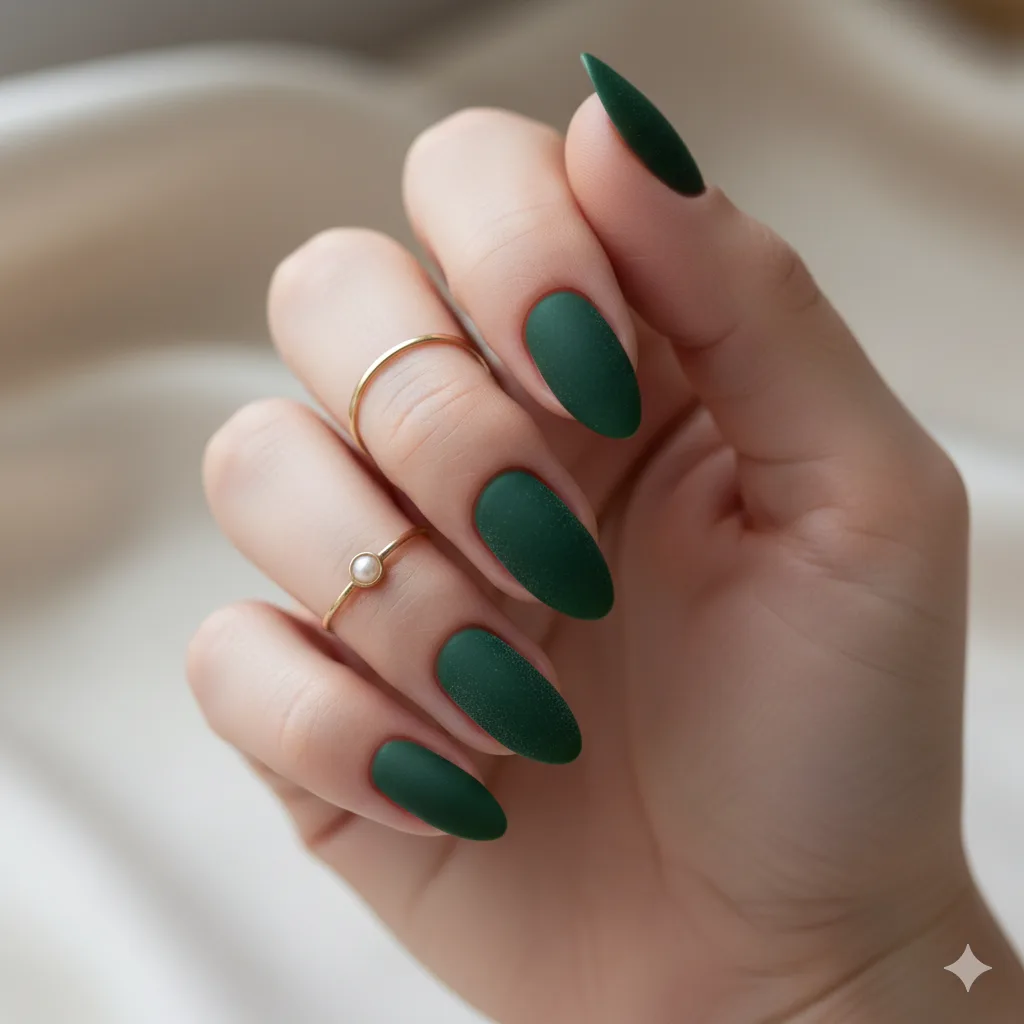 The velvet nail trend pairs beautifully with almond shapes. Choose deep forest green for a luxurious, textured finish that’s both chic and cozy.