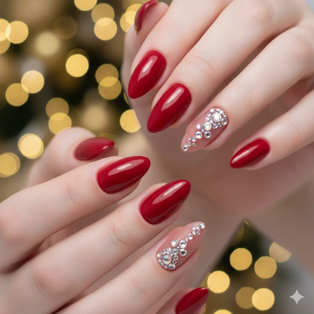 Turn up the glam with ruby polish and small rhinestones on accent nails. Ideal for Christmas parties or New Year’s Eve — this look screams celebration and confidence.