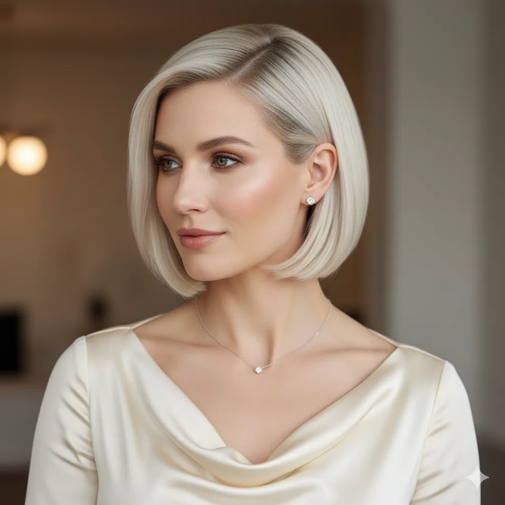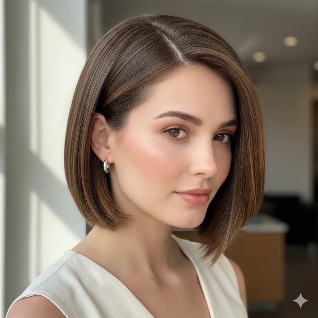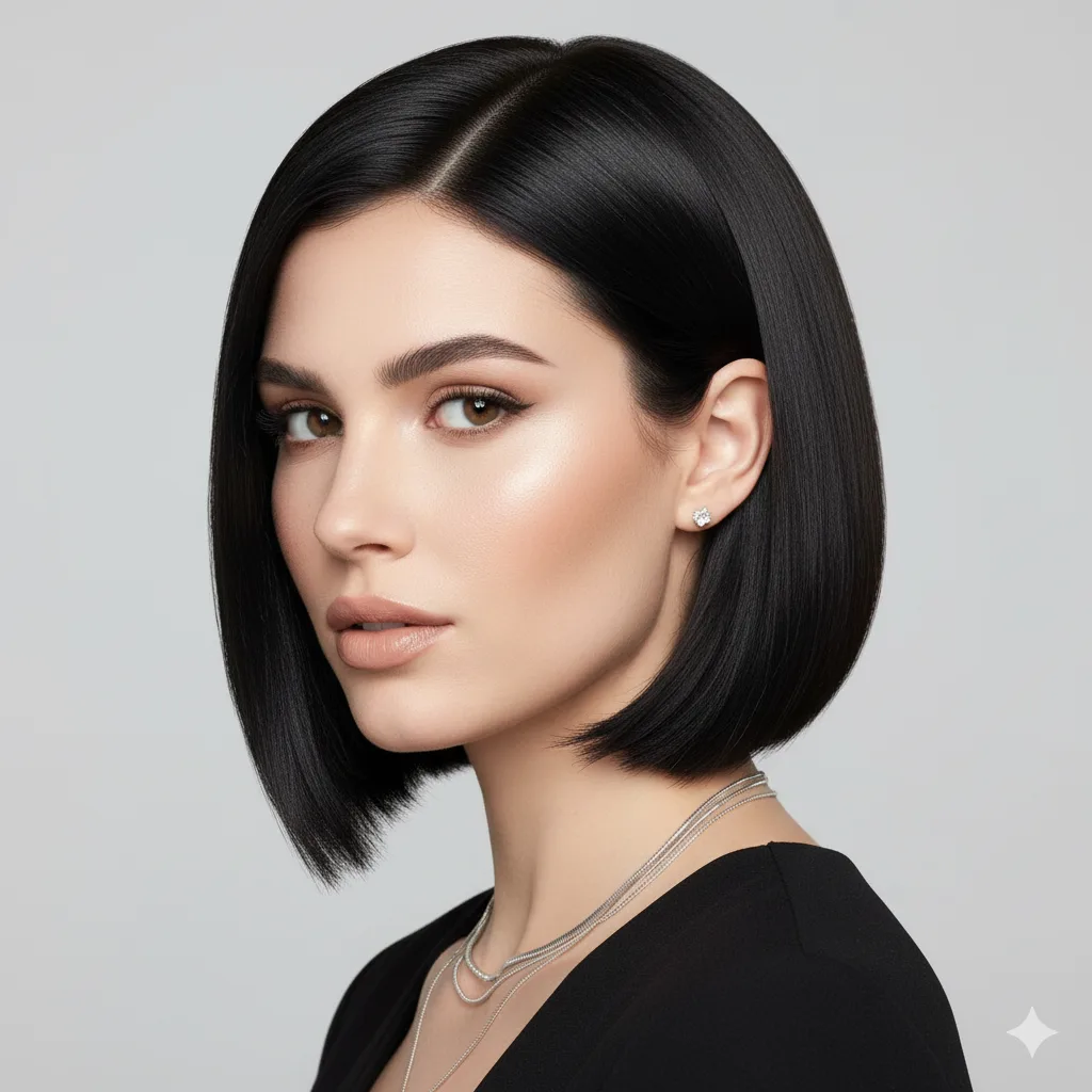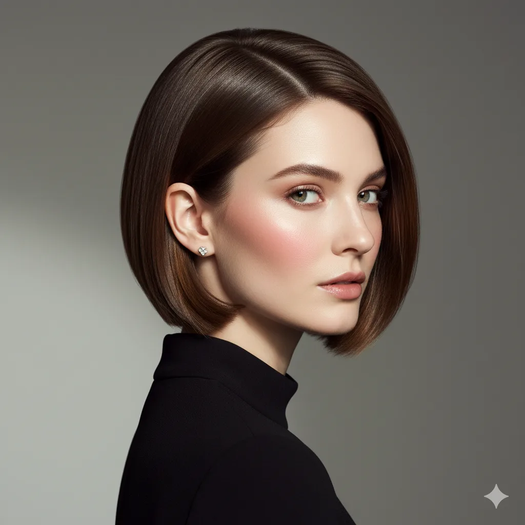 Minimalist yet powerful — straight lines and glossy shine define this modern cut. Ideal for professional women. Apply a smoothing balm and flat iron lightly for mirror-like sleekness that exudes confidence.