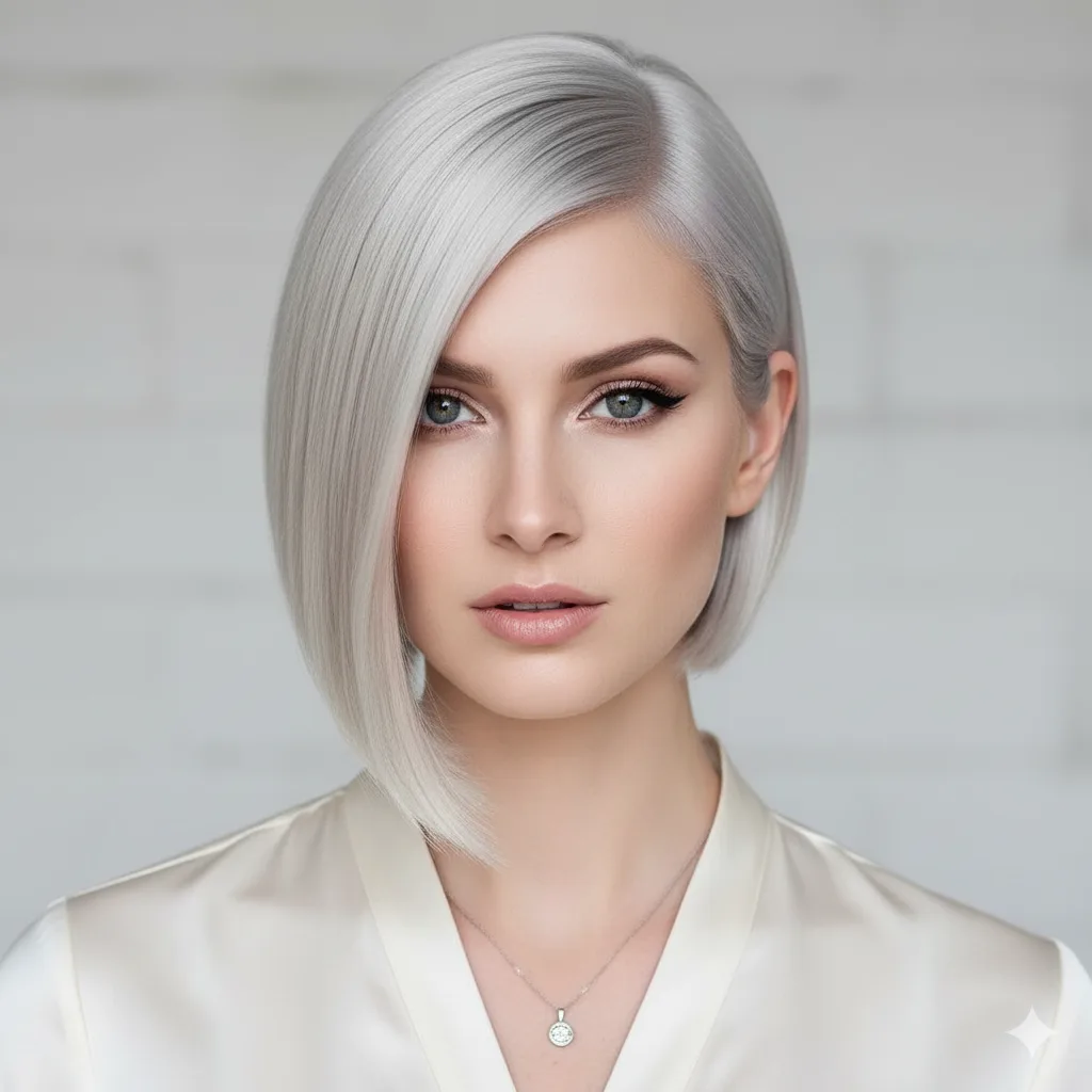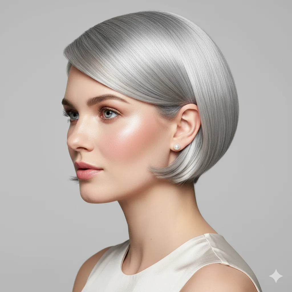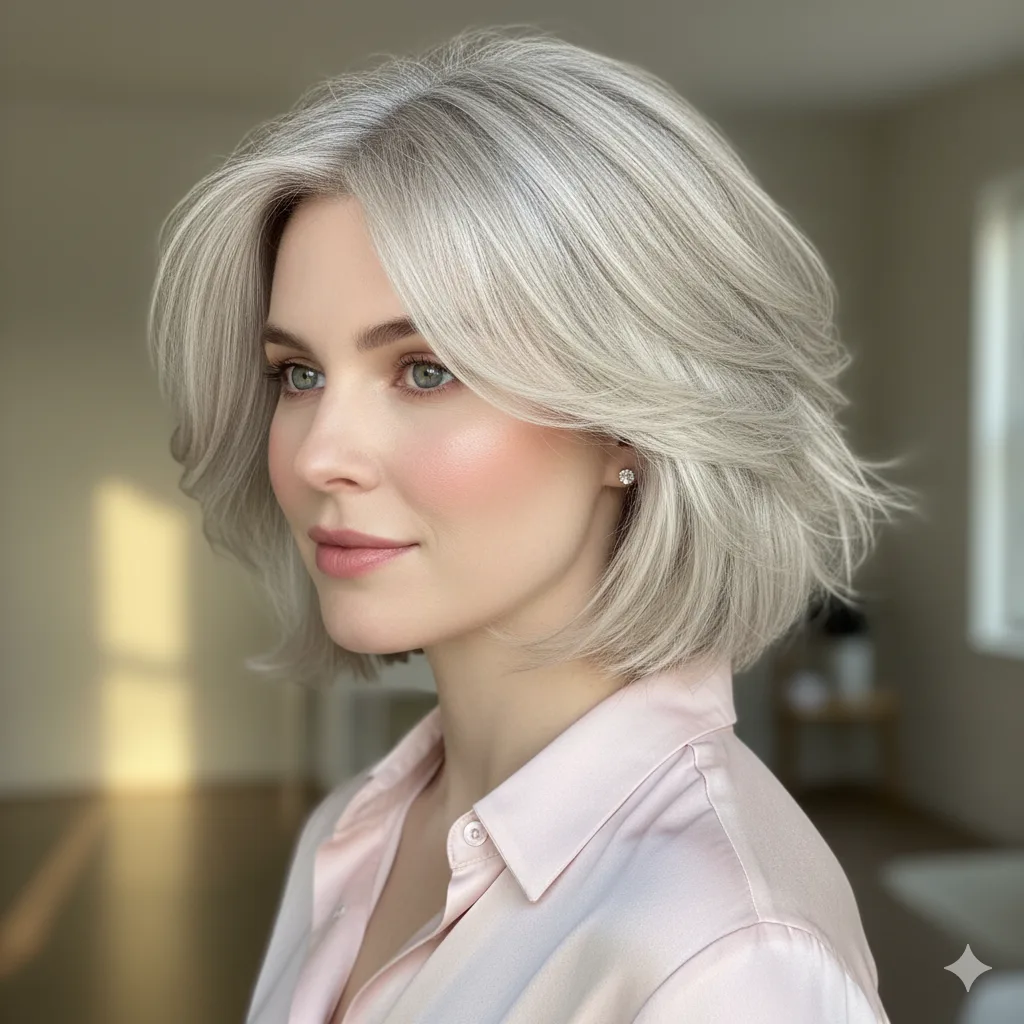Modern and sophisticated, this style plays with cool silver tones that catch the light beautifully. Works best on medium-density fine hair. Use smoothing serum to maintain shine and structure for this futuristic 2025-ready vibe.