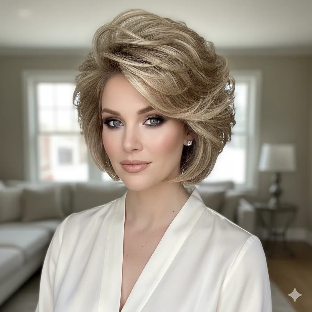 The ultimate lift-enhancing look — multiple short layers stacked high at the back create instant fullness. Great for women with thin hair who want big results. Use a root-boosting spray and round brush to amplify body.