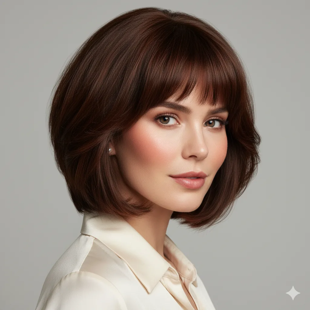 Full fringe meets stacked layers in this volume-boosting combo. Perfect for long faces or high foreheads. Blow-dry bangs forward for a youthful frame, and finish the back with volumizing spray for subtle lift.