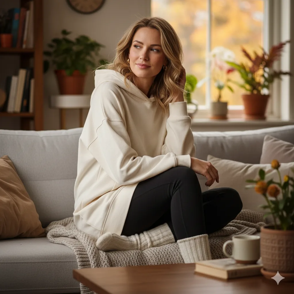 A longline hoodie with fitted leggings provides warmth without compromising mobility. Suits all heights and body types. Soft socks or moccasins complete this cozy, everyday ensemble.