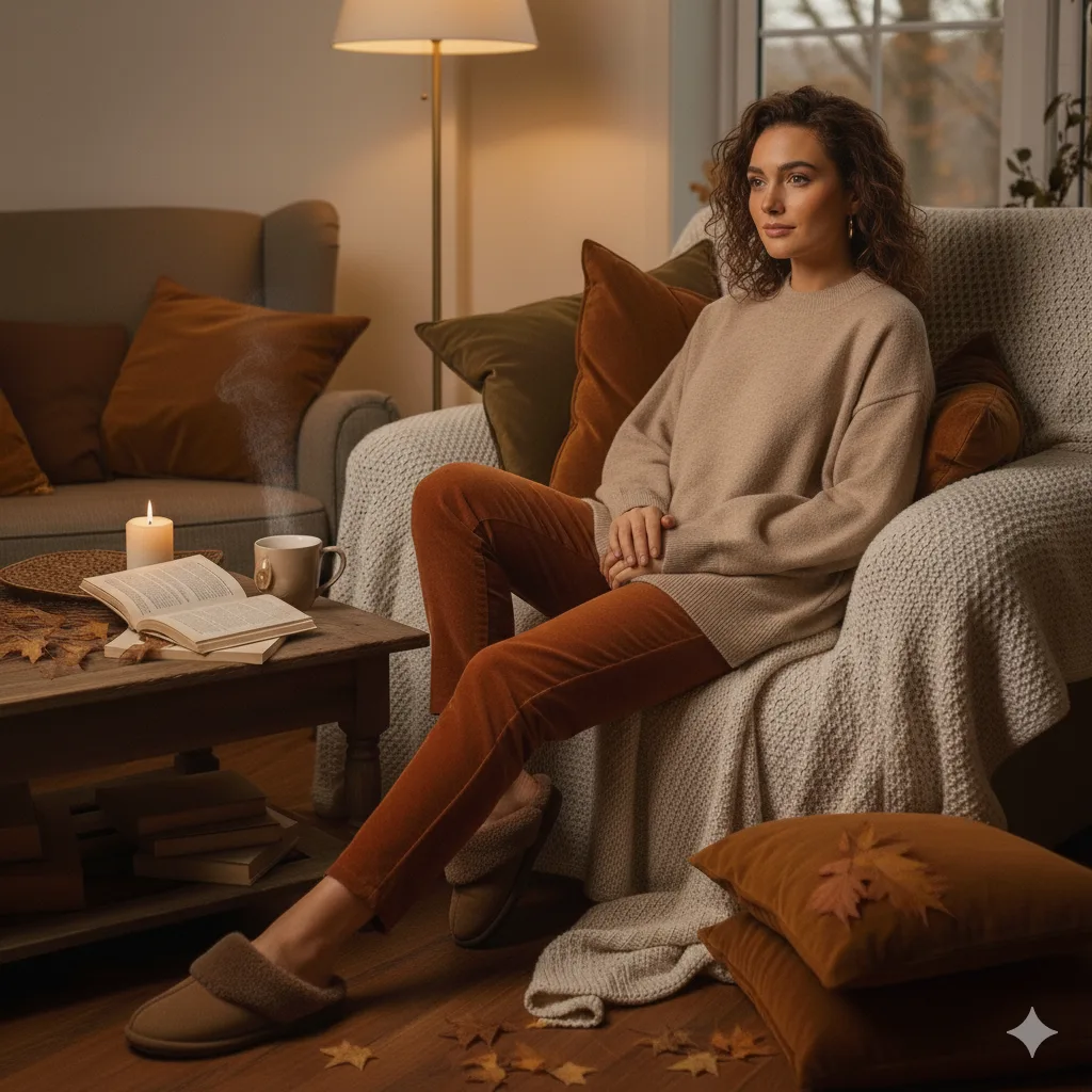 Layer an oversized sweater vest over a long-sleeve top with soft joggers. Suits rectangle or petite figures. Keep accessories minimal and choose warm neutral tones to stay chic indoors.