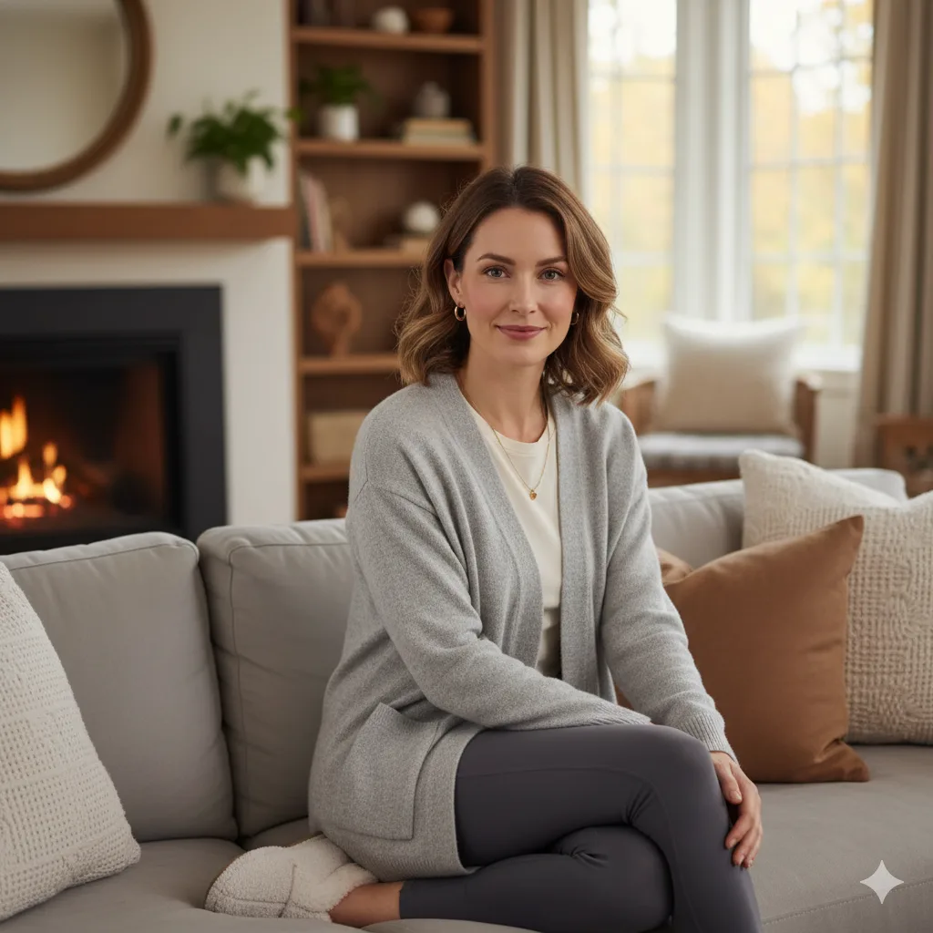 Pair a longline cardigan with coordinating joggers for warmth and flexibility. Works best on taller or rectangle-shaped moms. Add cozy slippers and subtle earrings for a polished lounge look.