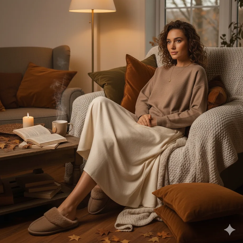 A relaxed pullover sweater tucked slightly into a soft maxi skirt creates effortless elegance. Suits taller and curvy figures. Keep hair down and accessories minimal for a cozy-chic vibe.