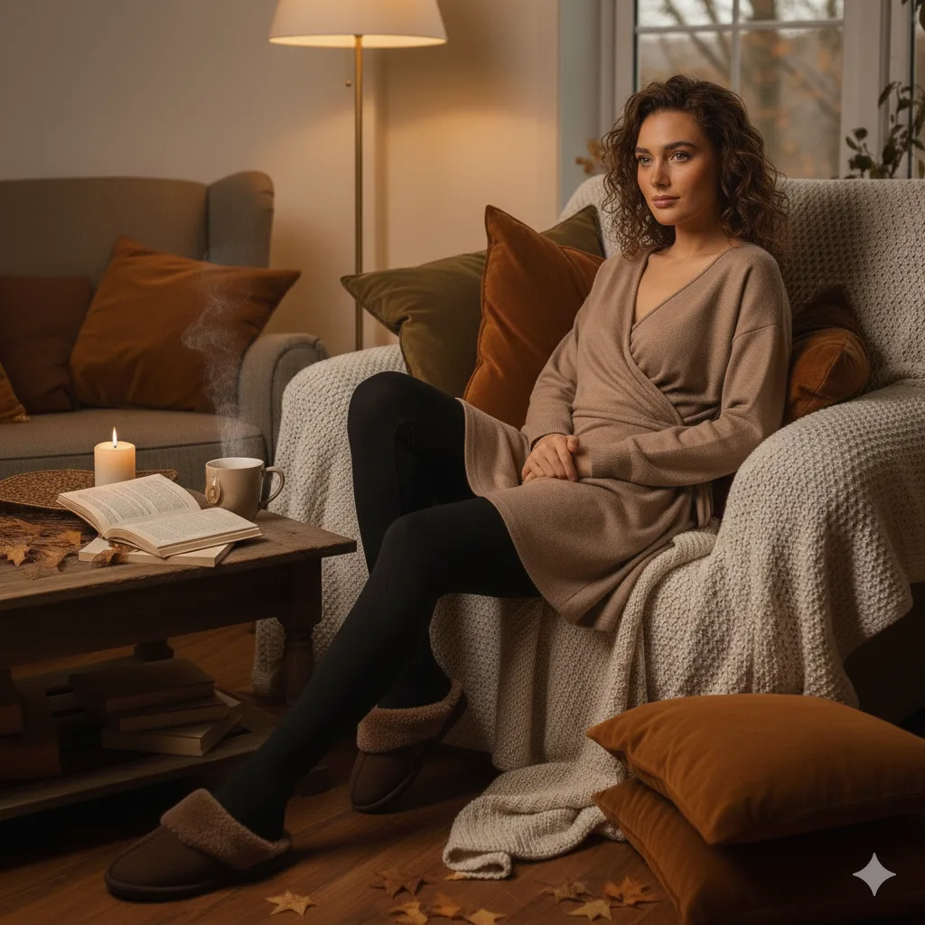 A wrap cardigan over a fitted tee and leggings adds instant coziness. Great for curvy or hourglass shapes. Tie the belt loosely for a relaxed feel and finish with slippers or socks.