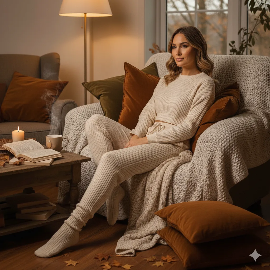 Matching knit sets are trending in women’s style trends 2025. A taupe or cream ribbed set works for all body types. Add minimal gold hoops or a delicate necklace for a polished yet relaxed at-home vibe.