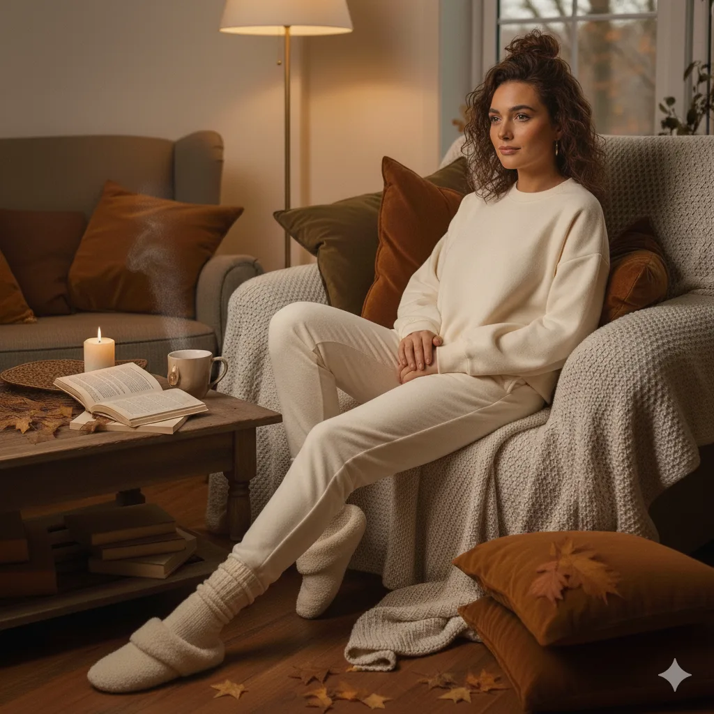 Soft fleece-lined joggers with a matching sweatshirt keep you warm all day. Neutral shades suit all body types. Pair with fuzzy socks or slippers for indoor comfort with style.
