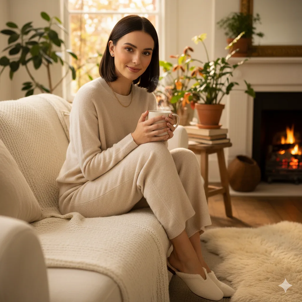 Luxurious yet practical, a cashmere pullover with matching knit pants brings elevated fashion for women into your daily routine. Works well for pear and hourglass shapes. Neutral tones enhance the sophisticated at-home look.