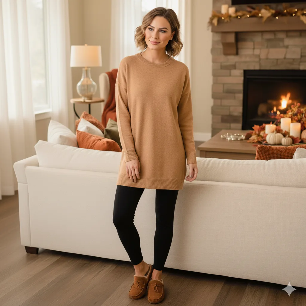 A sweater tunic with side slits flatters all body types, especially petite moms. Pair with leggings or slim joggers. Add dainty jewelry and cozy footwear to elevate casual comfort.
