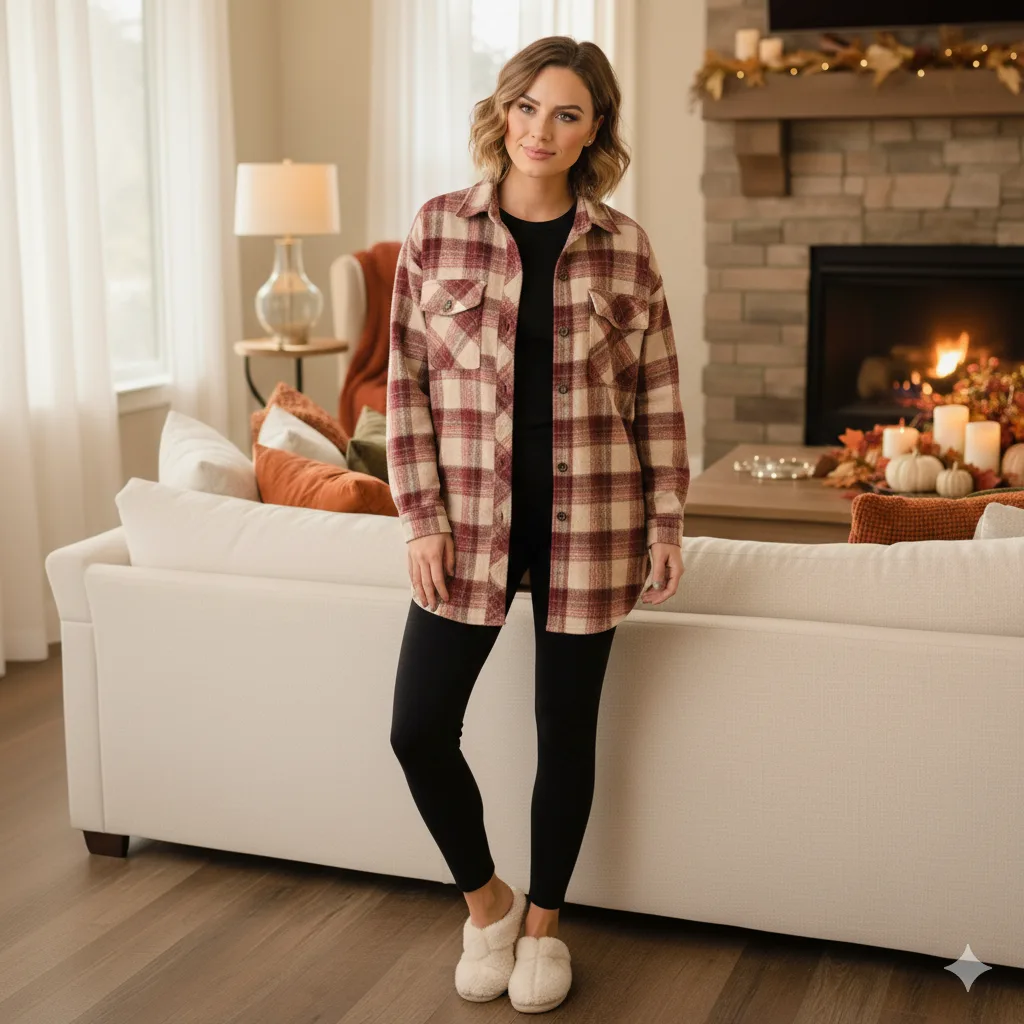 Stay warm in a cozy flannel shirt over leggings. Perfect for busy mornings or casual video calls. Pair with cute socks or slippers and natural makeup for a relaxed fall aesthetic.