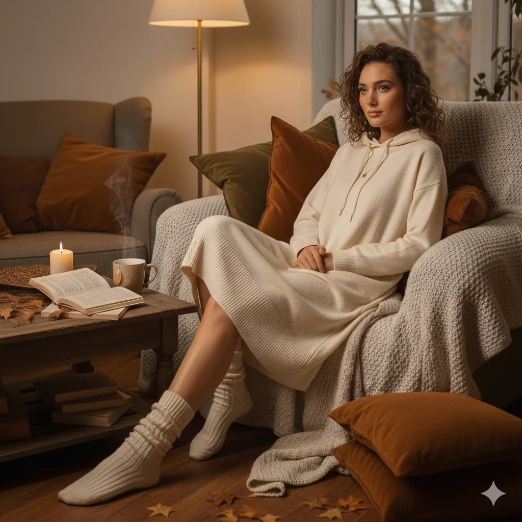 A knit hoodie dress paired with over-the-ankle socks is the ultimate at-home fall look. Works on petite and medium heights. Soft curls and minimal makeup enhance the casual style.