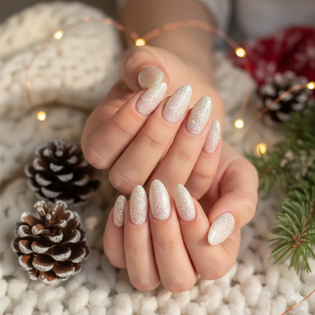 Silver glitter nails are your ticket to instant glam. Layer fine shimmer polish over a clear or light gray base for that “frost-kissed” look. Elegant yet fun — ideal for December evenings.