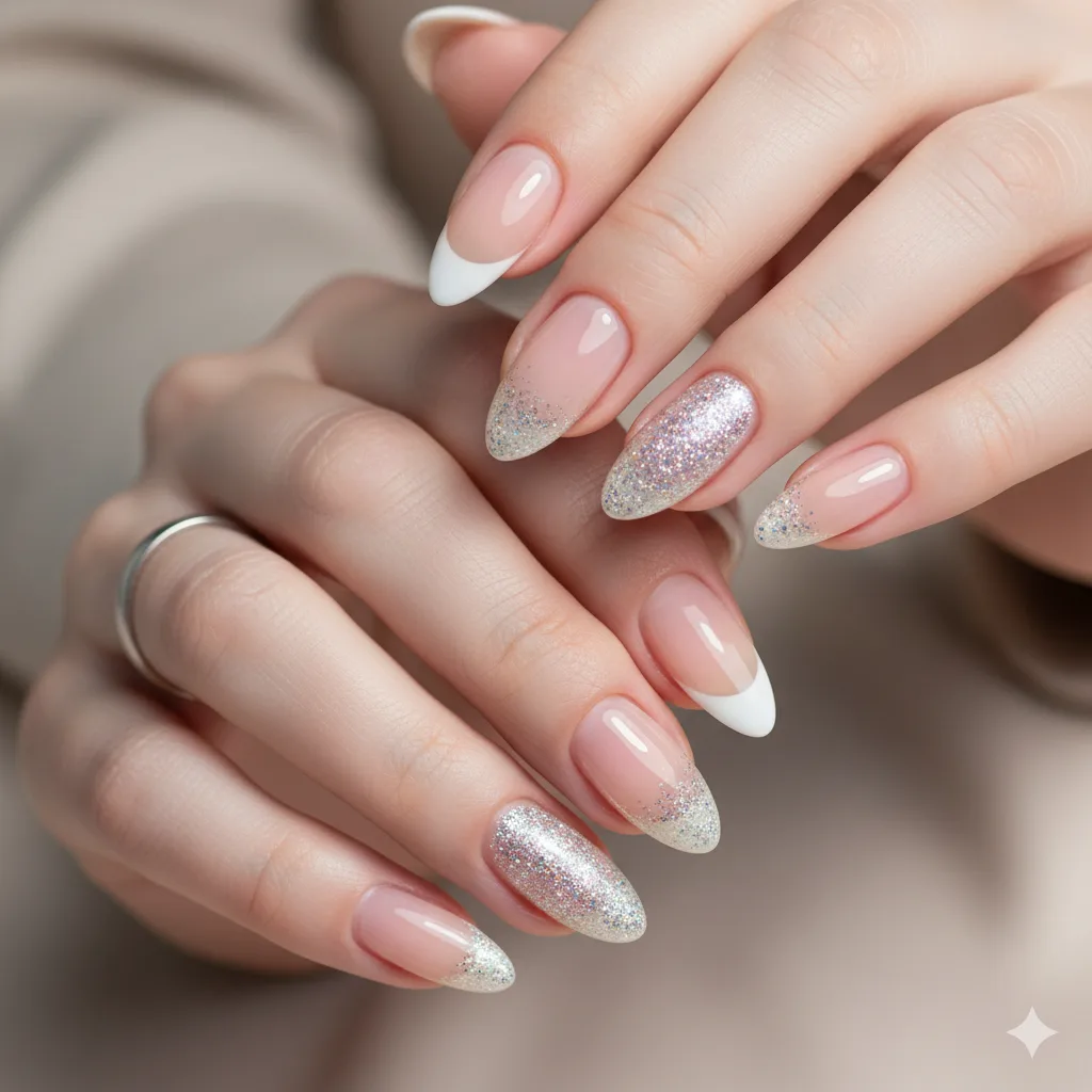 Classic French nails with glitter tips bring subtle sparkle to your look. It’s timeless, elegant, and perfect for the holiday season — minimal effort, maximum glam.