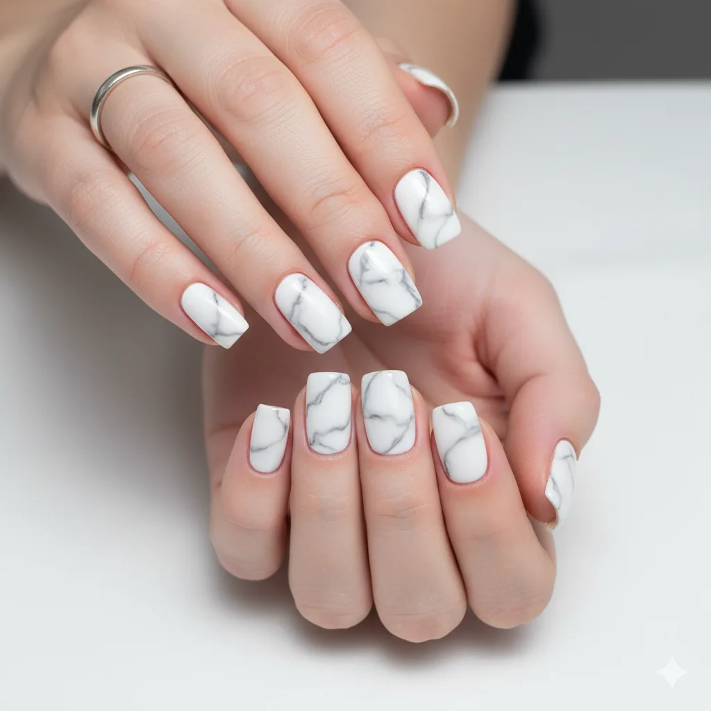 A marble design in white and soft gray adds a luxurious feel. Ideal for polished winter looks, this style works for both short and long nails.