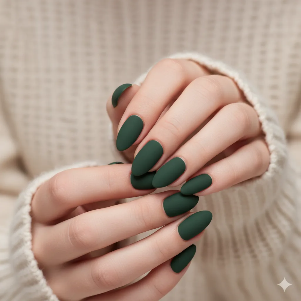 Matte forest green nails embody cozy sophistication. Pair with neutral knits or plaid coats for a warm, nature-inspired holiday look.