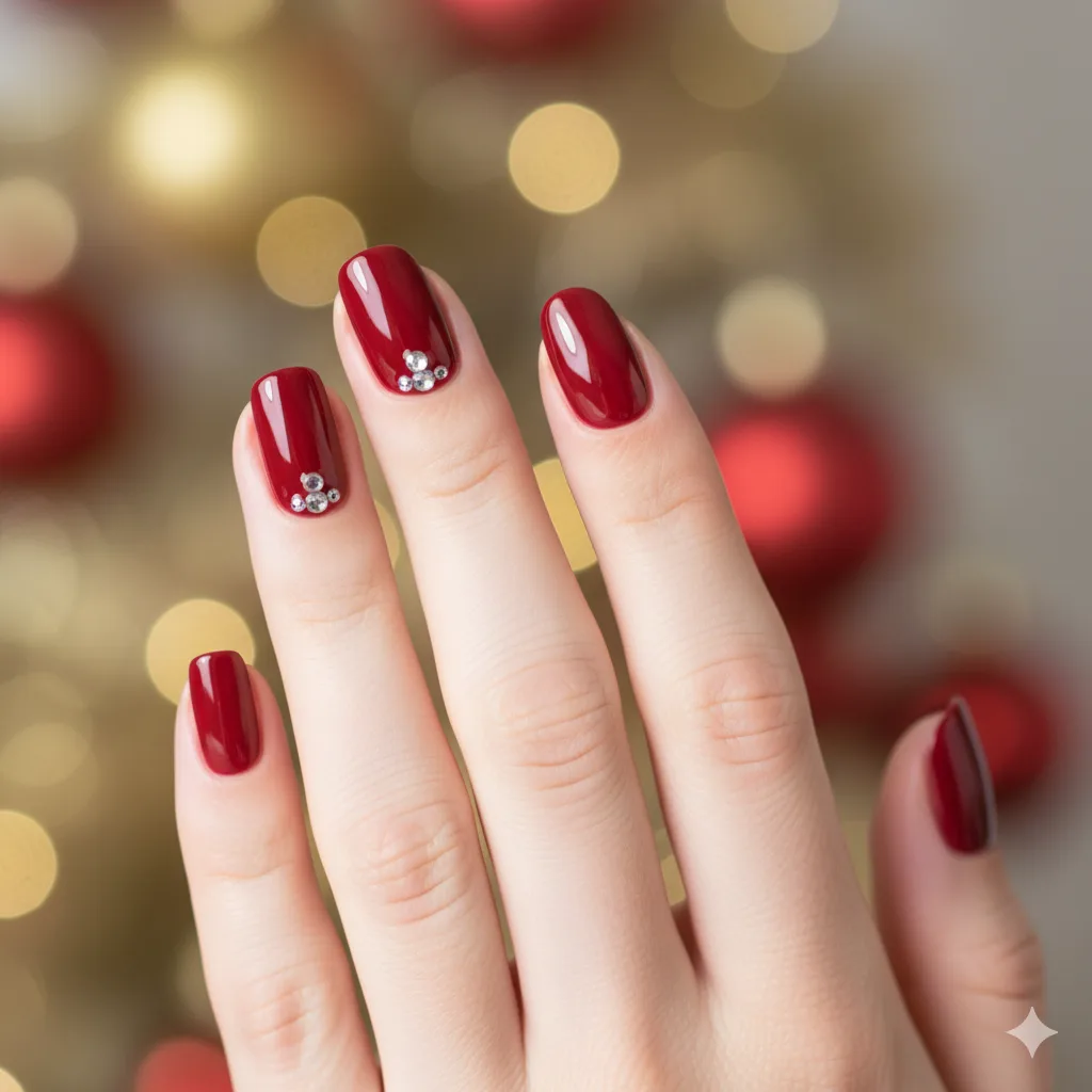 Add tiny rhinestones to ruby red nails for subtle sparkle. This nail look suits every occasion — from festive gatherings to romantic nights out — classic with a glamorous twist.