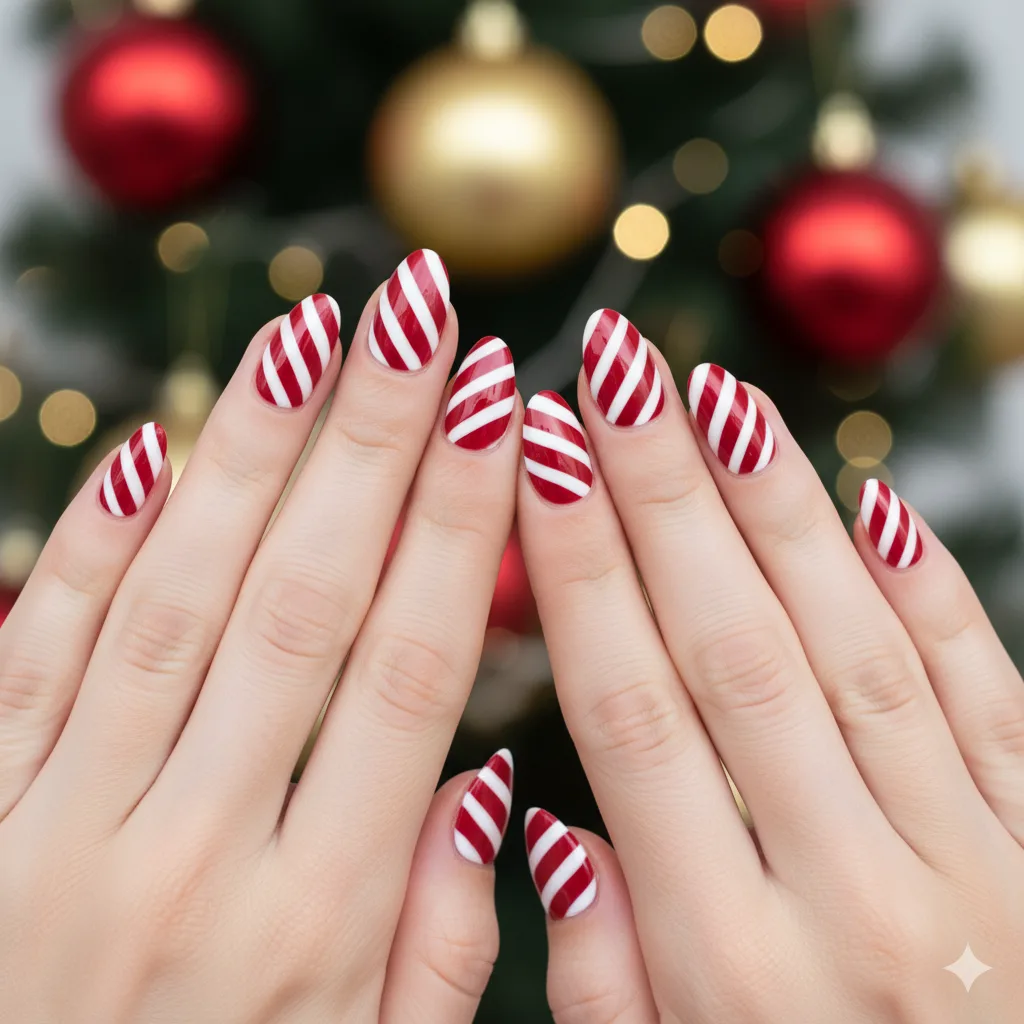Give your French manicure a twist with red and white candy cane stripes. It’s playful yet elegant — a perfect nod to the season’s sweet treats and joyful energy.