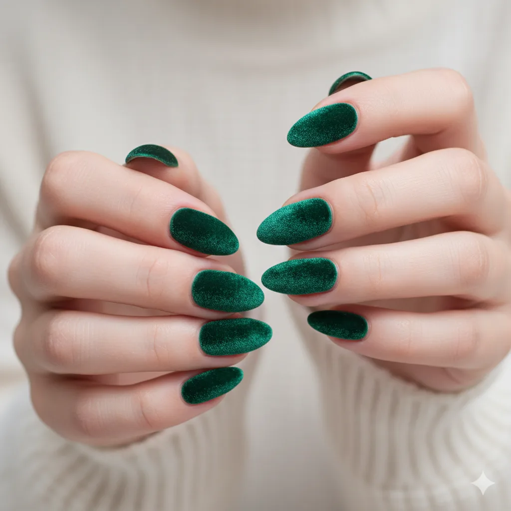 Emerald nails with a velvet finish bring luxury to your fingertips. The soft texture and rich tone embody winter warmth. Pair with gold jewelry or a beige sweater for a high-end seasonal vibe.