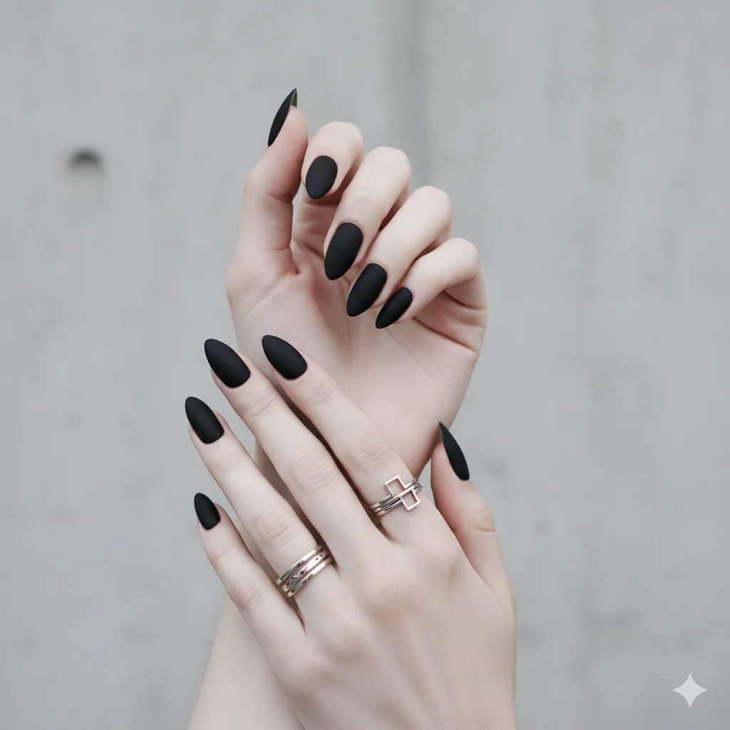 Matte black nails are bold, edgy, and sophisticated. Add a small gem or glossy tip for dimension. Great for women who love minimalist drama.