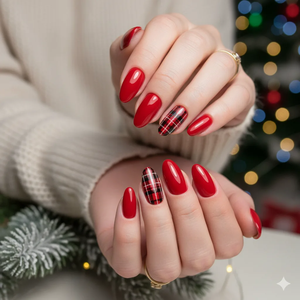 Mix plaid-patterned accent nails with solid red ones for a festive twist. Great for casual holiday looks, this design feels both cozy and stylish.