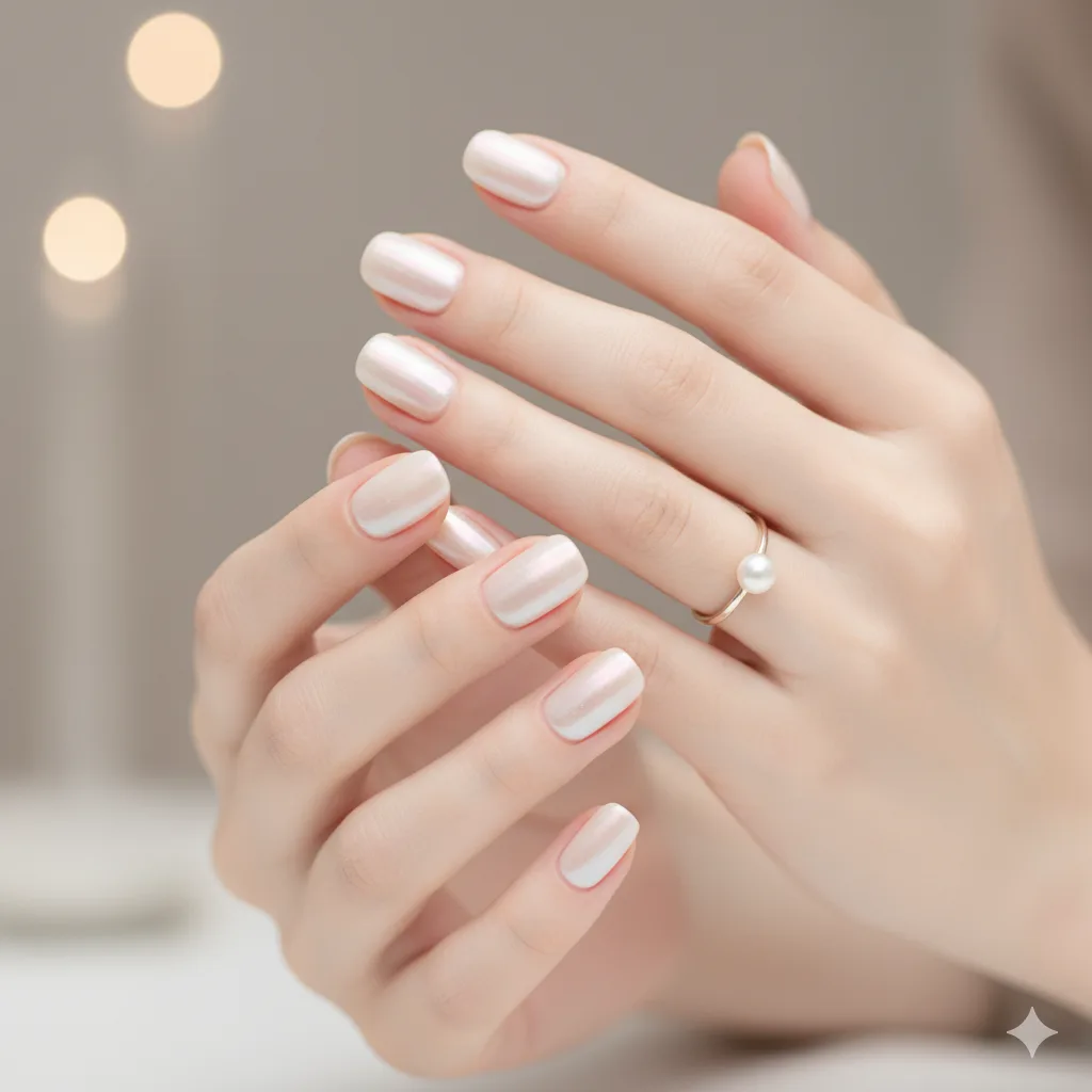 Soft white nails with a pearlescent glow offer a delicate, feminine finish. Ideal for women who love clean, subtle beauty — works beautifully with all outfits.
