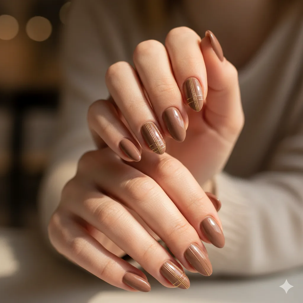 Rich mocha nails with metallic streaks are warm yet polished. This versatile tone suits both casual and formal outfits — perfect for women with classic style.