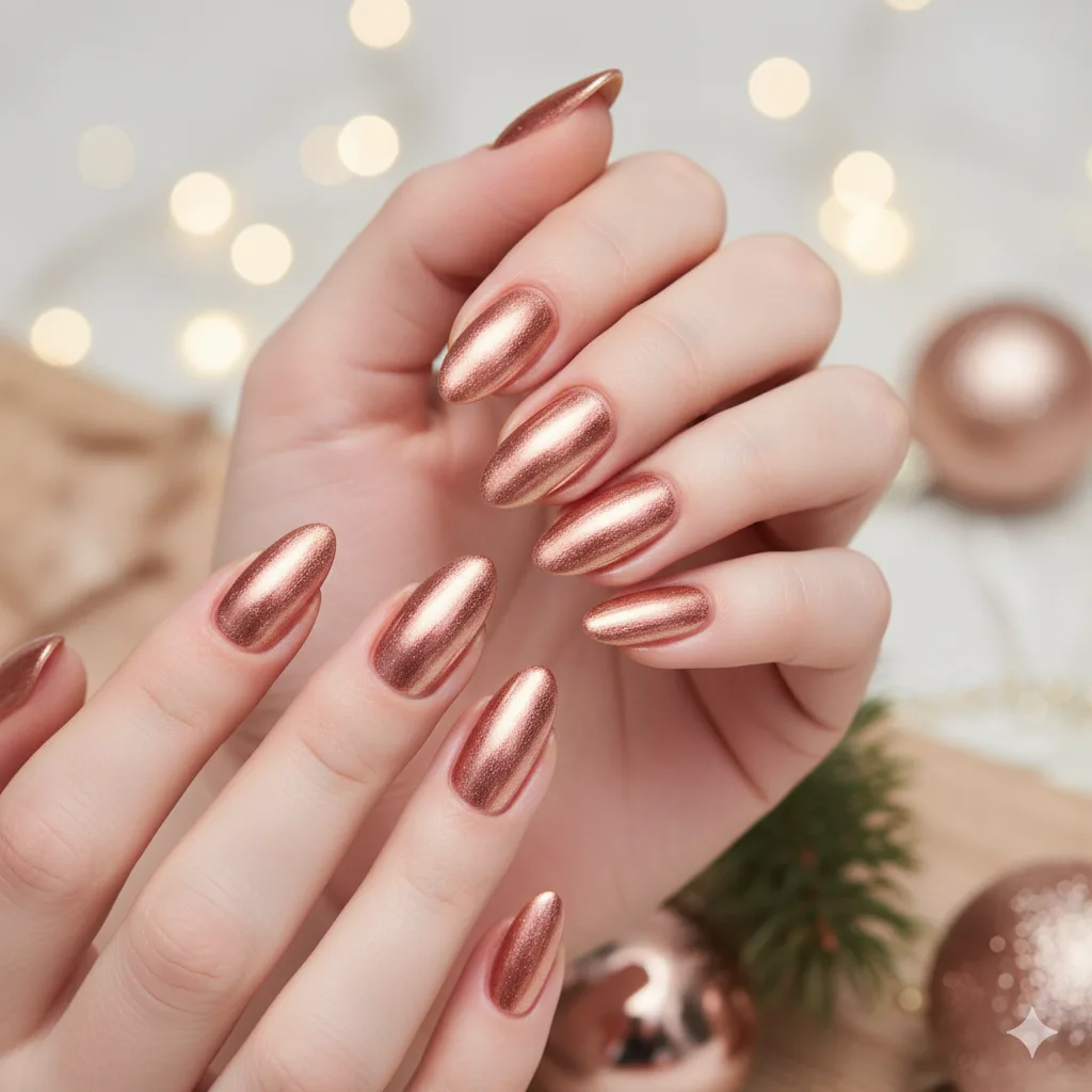 Rose gold nails bring a romantic shimmer that transitions seamlessly from day to night. Add a glossy finish to make them even more radiant.